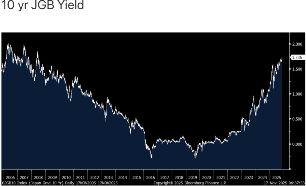 Excessive debts and deficits matter in Japan as the 10 yr yield rose to a fresh 17 yr high overnight, up 2.6 bps to 1.74% in response to the fiscal spending proposals that are coming from the administration of the new PM.