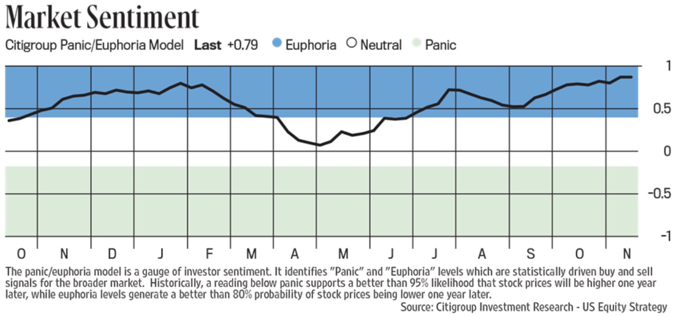 Peter Boockvar: The Citi Panic/Euphoria index measuring sentiment on the stock market is now at .79, almost 2x the Euphoria threshold of .41. The chart had to be widened out to include the new print seen on Saturday.