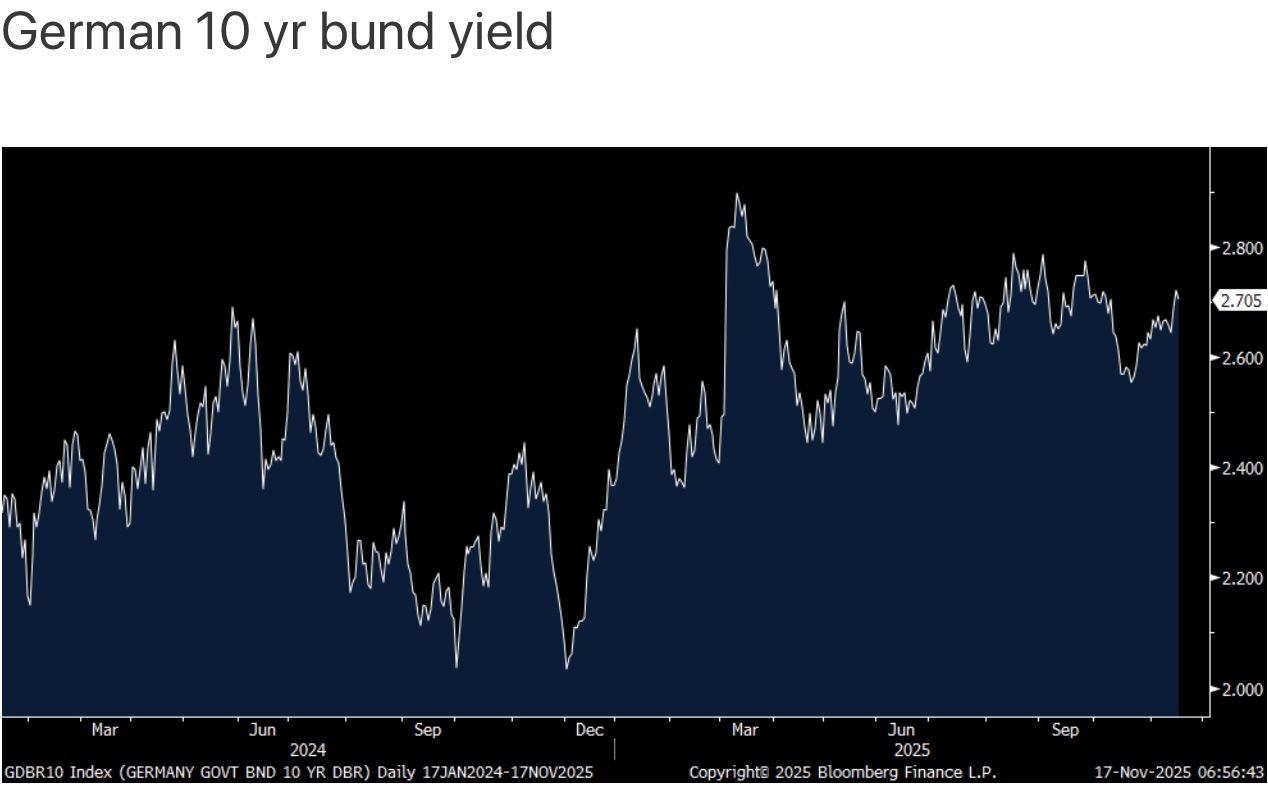 The 30 yr yield was up by 4.5 bps to 3.27% and the 40 yr yield was higher by 5.2 bps to 3.61%. The 10 yr inflation JGB breakeven was up by 5 bps to 1.60%. Also of relevance is that the move higher in the long end is happening irrespective of what the BoJ is doing with short term rates, which currently remains nothing, though I think they hike next month. Sounds familiar as the Federal Reserve has cut rates by 150 bps and the 10 yr yield is barely lower since. And in Europe, the ECB has cut its deposit rate by 200 bps since June 2024 and the German 10 yr bund yield and the French 10 yr oat yield are higher over this time frame.