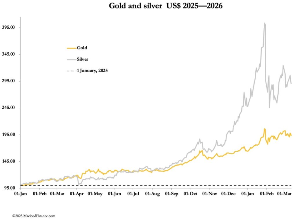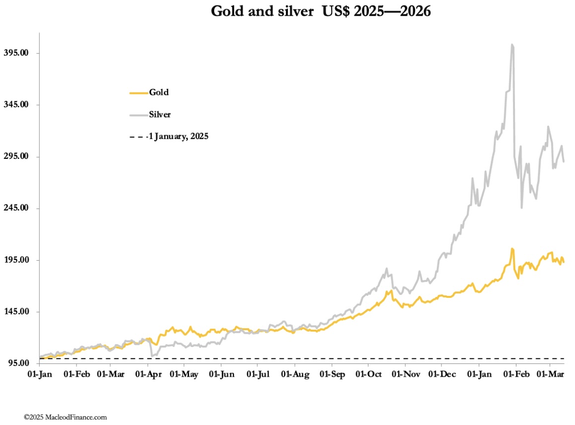 March 13 (King World News) – Alasdair Macleod: Gold and silver on pause as funk-money flies to $US. It is becoming clear that Iran is no push over and the economic consequences of this war are dire, with oil at $100 and going higher.