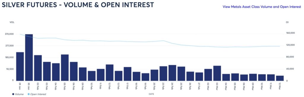 Comex silver futures are running on vapour, with volumes declining to negligible levels, while open interest remains at 20-year lows, demonstrating a total lack of speculator interest. This is shown next: