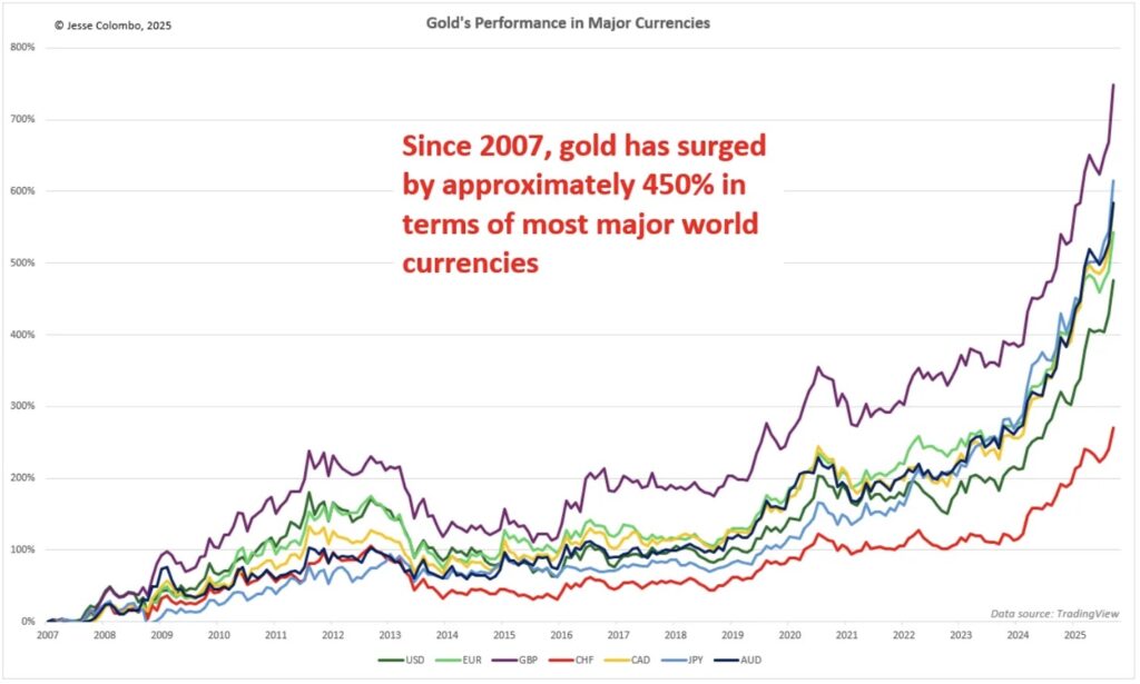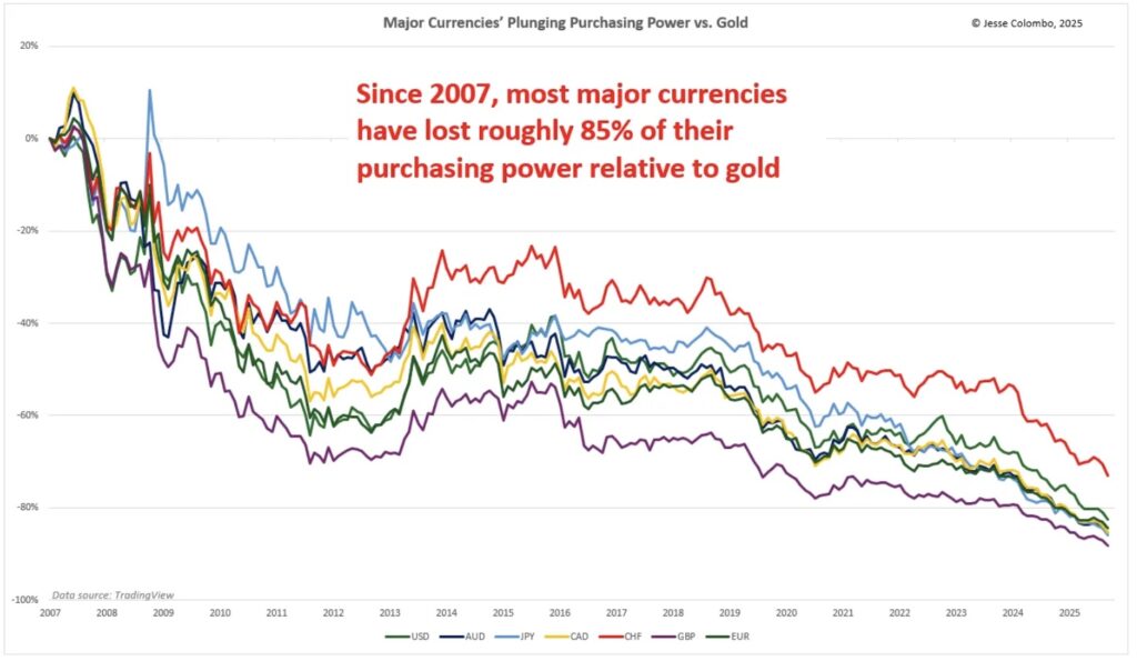 Jesse Colombo: Whenever gold rises and I get excited as a gold investor, I’m often met with the familiar refrain: “Gold isn’t really going up, the dollar is just losing value.” I used to brush that off as a cliché or a game of semantics, and honestly, it annoyed me. But over time I decided to dig deeper. I started analyzing the data visually, which is my favorite way to learn, and that’s when it finally clicked. They were right. Gold wasn’t truly soaring; fiat currencies were quietly eroding. Since then I’ve made it a mission to help others see this clearly too, using compelling charts that drive the point home. That’s exactly what I’m going to show you today.
