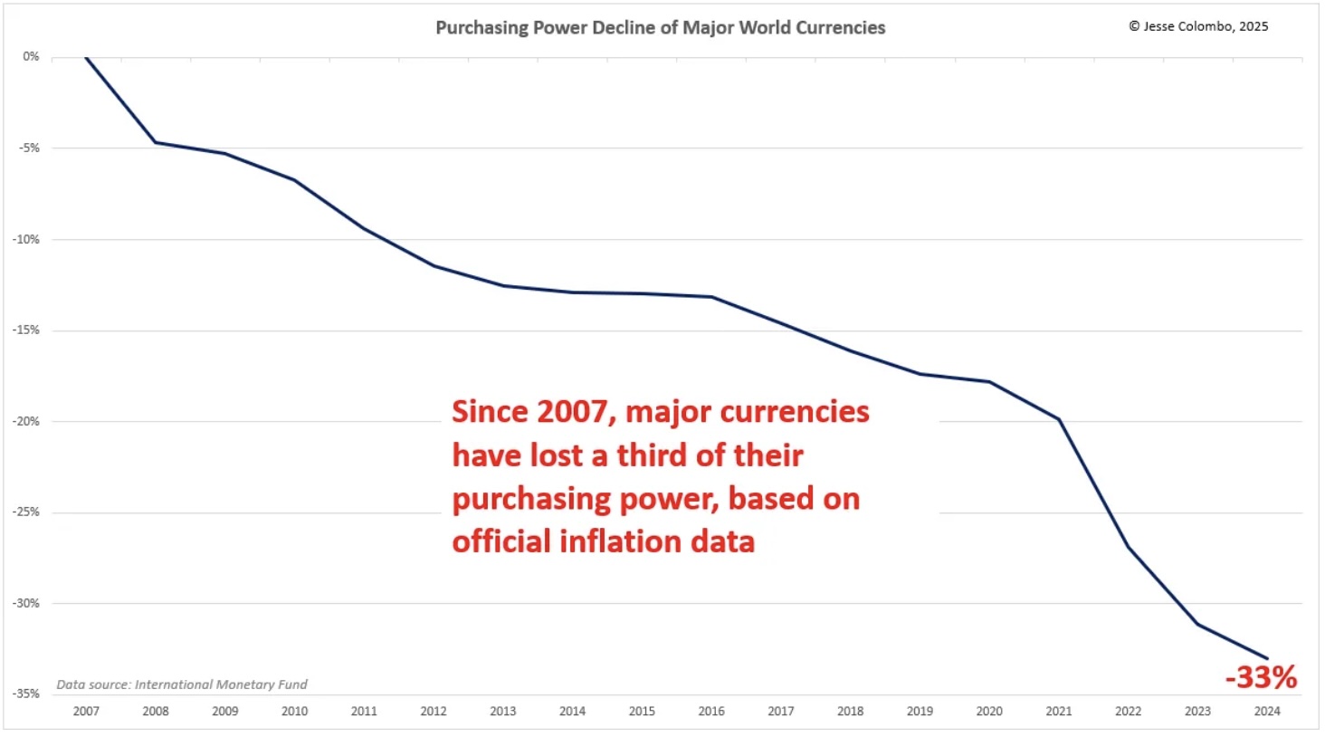 I calculated the average CPI for the major world currencies referenced throughout this report and found that, on average, they’ve lost 33% of their purchasing power since 2007. The resulting chart closely mirrors the gold-based purchasing power chart shown earlier, with the steepest declines occurring during two key periods: 2007 to 2012 and 2020 to 2024. Both of these were periods of heavy monetary expansion during recessions or crises.