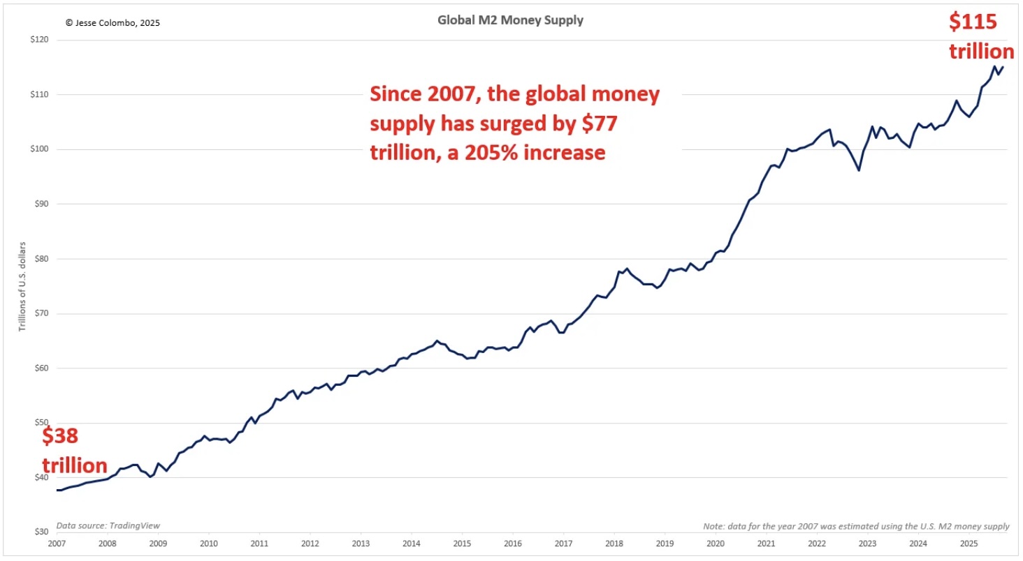 As the chart below illustrates, the global M2 money supply, one of the most widely used measures of total currency in circulation, has surged by 205% since 2007, rising from $38 trillion to a staggering $115 trillion. This massive expansion of the money supply is the driving force behind the soaring cost of living worldwide and a key reason why the price of gold has surged in every major currency across the globe.