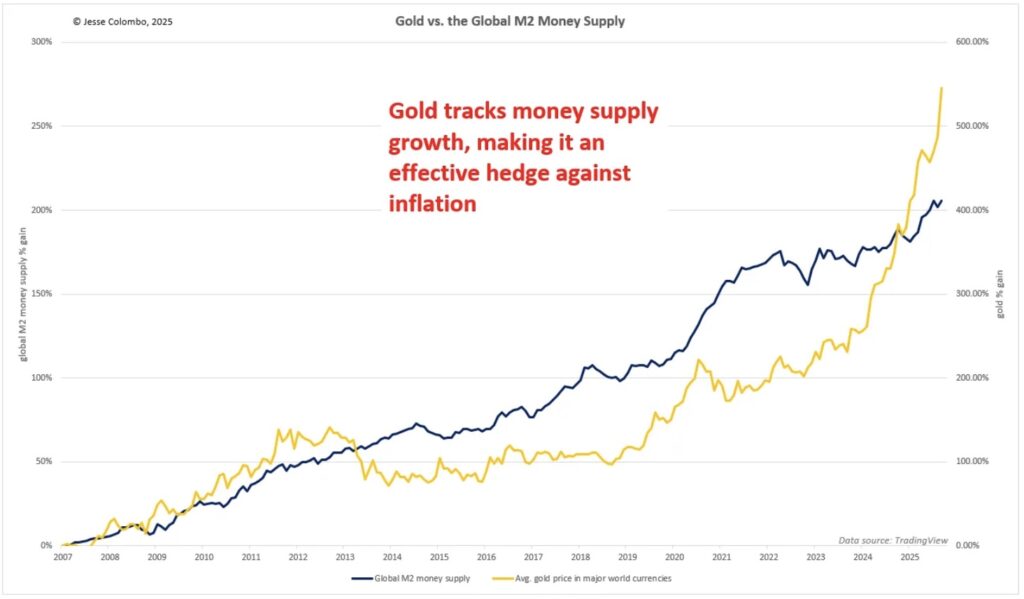 The next chart demonstrates how gold’s price closely tracks the growth of the global M2 money supply over time. This is the primary reason why gold remains the most effective store of value and hedge against inflation.