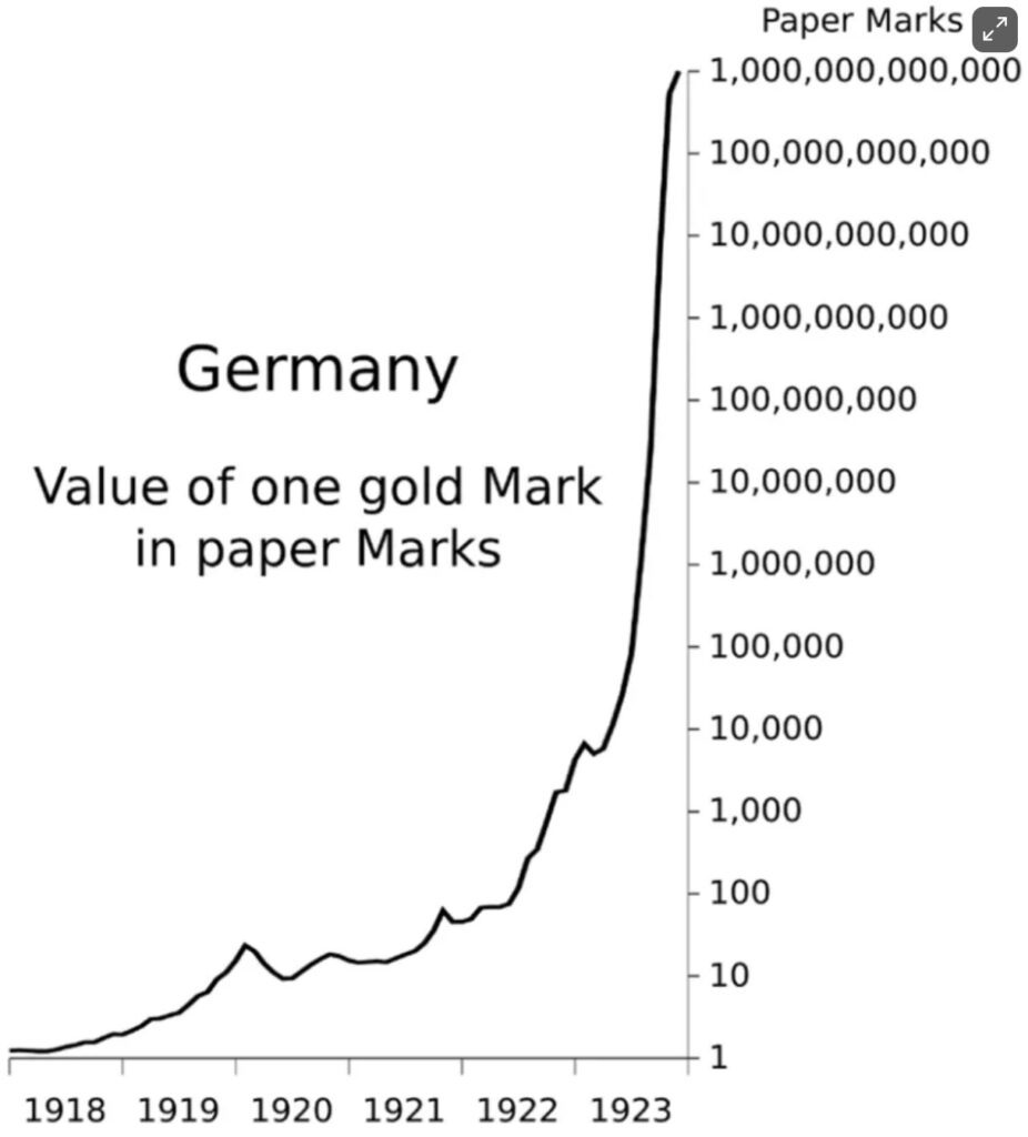The chart below illustrates how, during Weimar Germany’s infamous hyperinflation of the early 1920s, physical gold such as a single gold Mark coin not only preserved its value but also skyrocketed when priced in the rapidly devaluing paper Marks of the time. This happened because the Reichsbank, Germany’s central bank, was running the printing presses at full throttle to prop up a collapsing economy and cover massive government deficits.