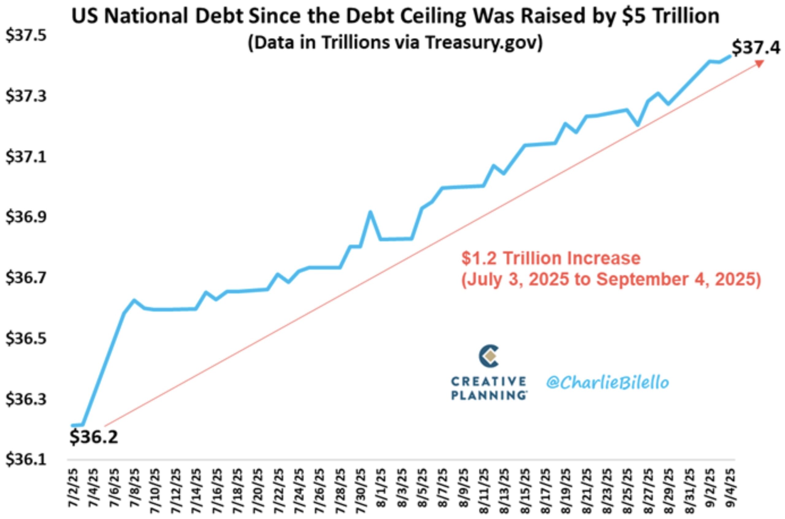 Charlie Bilello: The US National Debt has increased by $1.2 trillion since the Debt Ceiling was raised just two months ago.