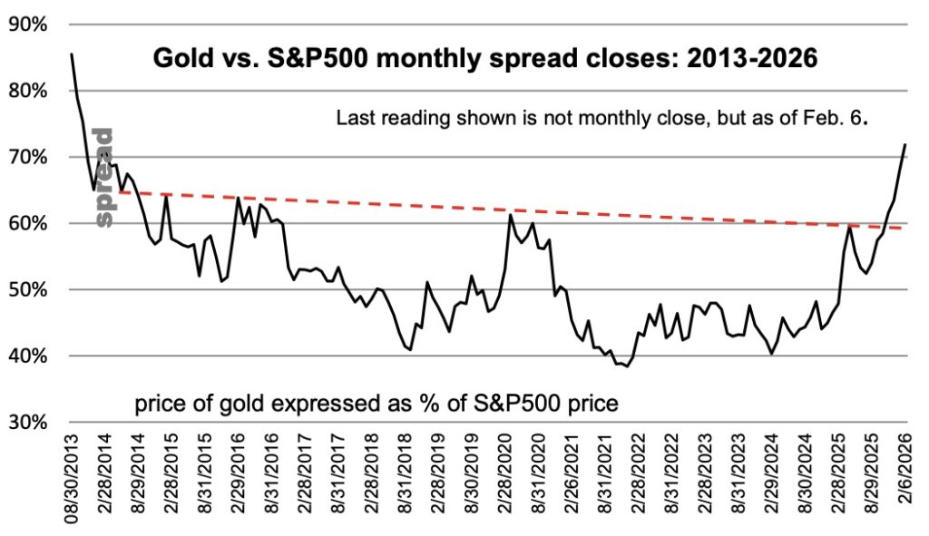 February 10 (King World News) – Michael Oliver, Founder of MSA Research: The November close on this spread [Gold vs S&P 500] broke out favoring gold, the mama monetary metal. Look at what’s happened since.