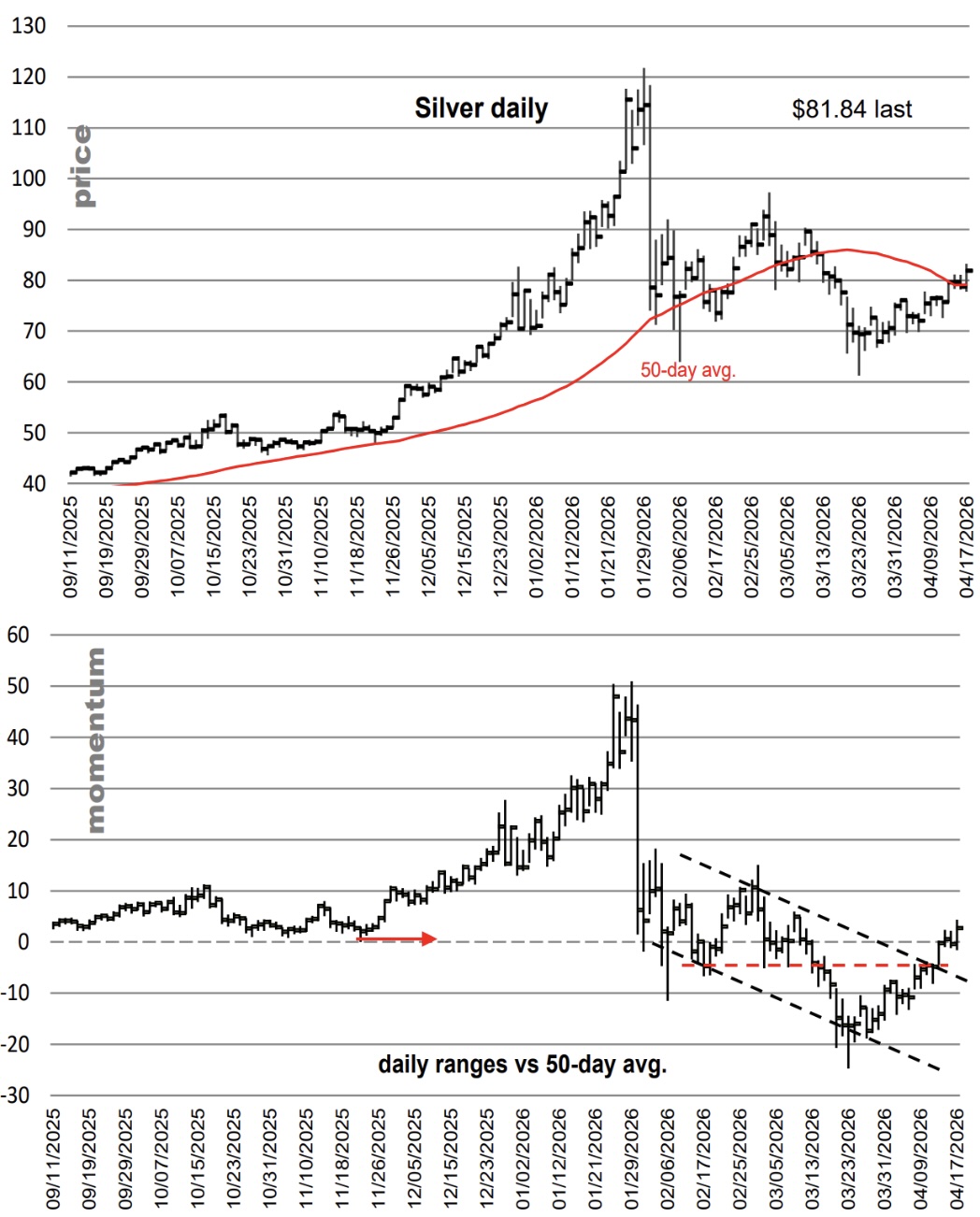 Our focus was on the parallel channel plotted through peak and low daily closes since the late January collapse. Action cleared the channel and the pivotal red line as well last week. This doesn’t mean there will be some sort of vertical surge now, but it does argue to MSA that this process has shifted back into upside. Also, this upward shift has occurred after the very brief price plunge on March 23rd that took out the early February price low—to no avail for the bears.
