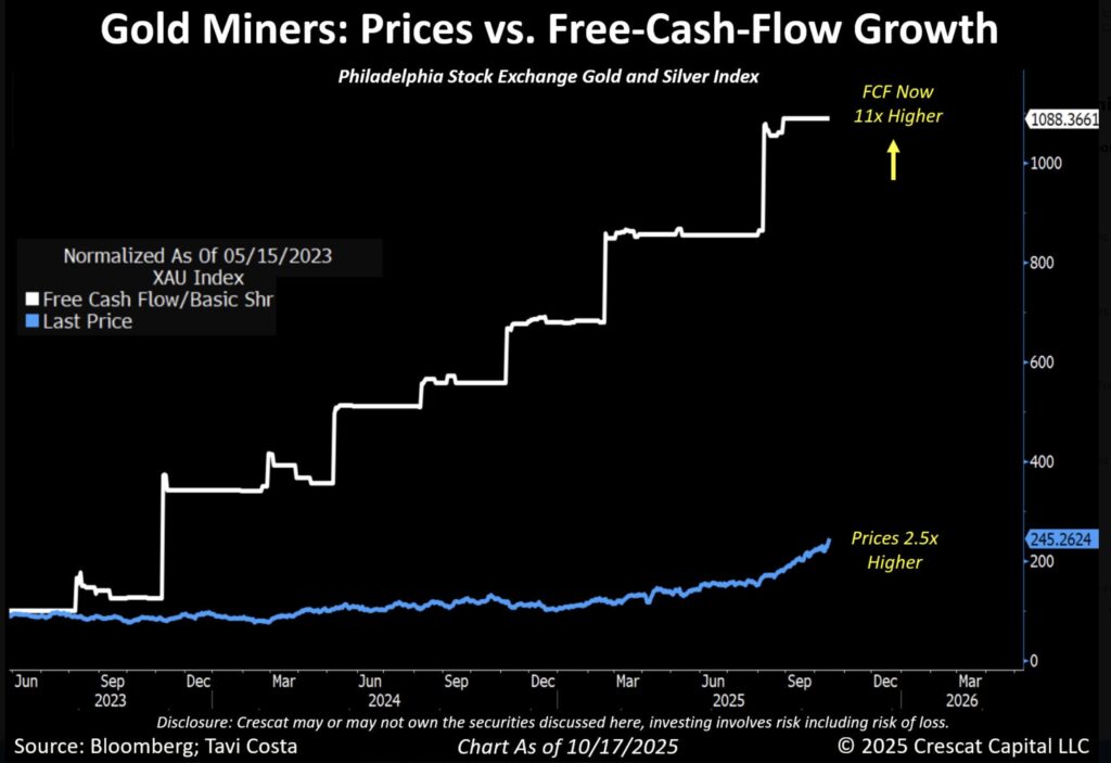 Yes, mining stocks have performed incredibly well recently, but the aggregate free cash flow of the Philadelphia Gold and Silver index has surged 11x.