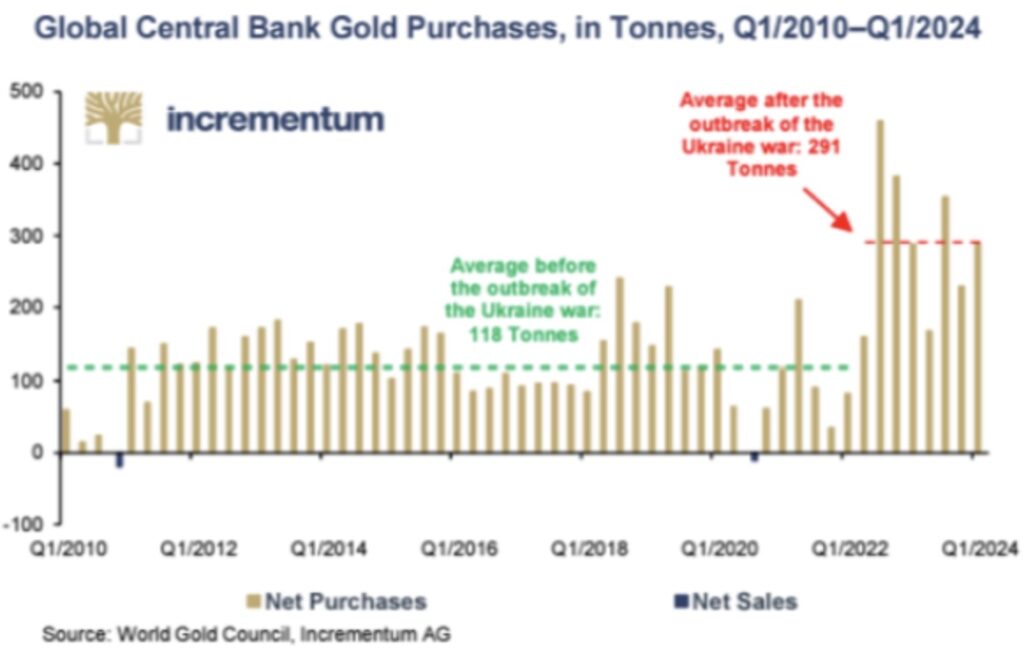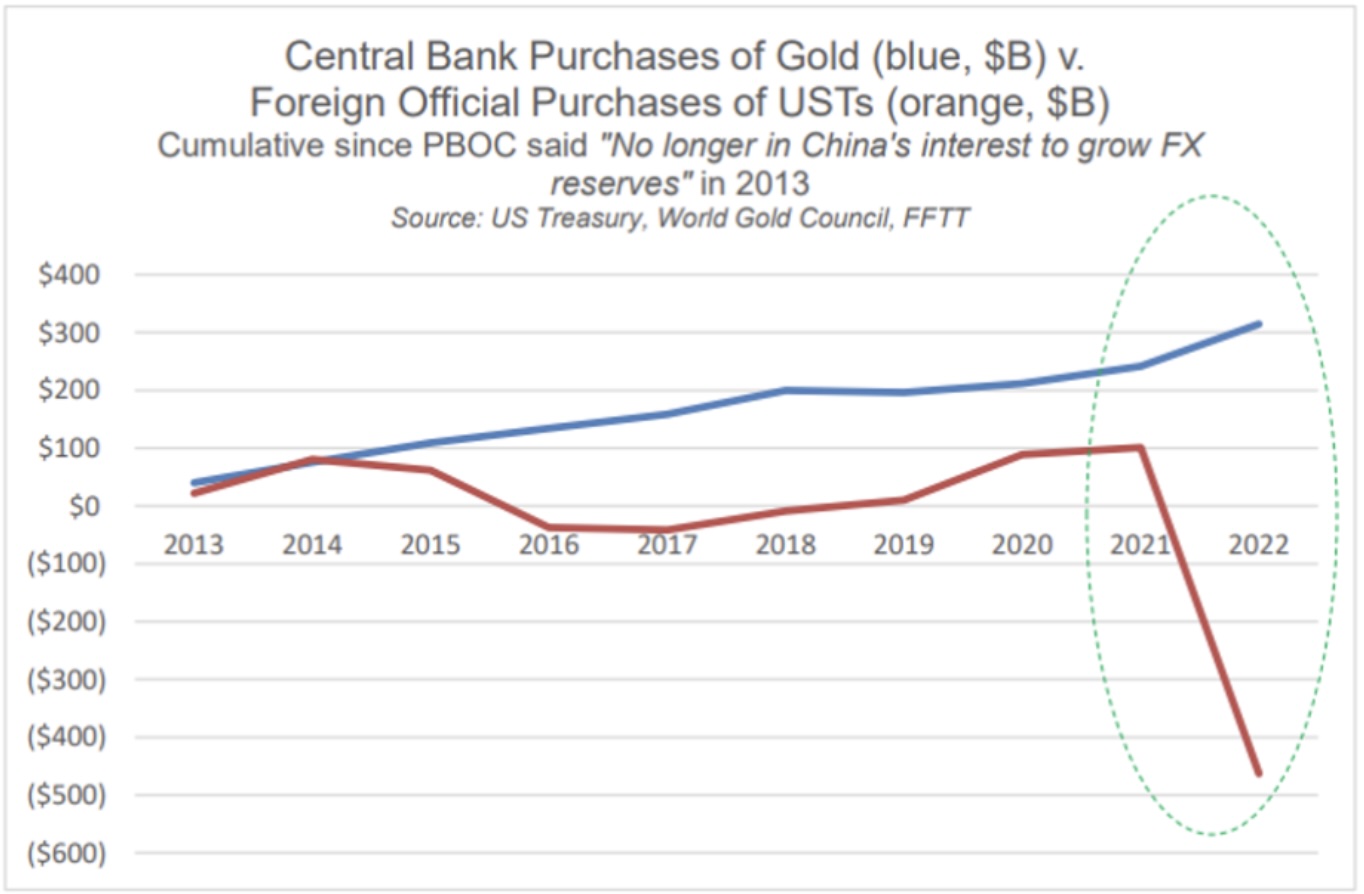 Through no coincidence at all, the pace of this move toward gold tripled after the 2022 sanctions.