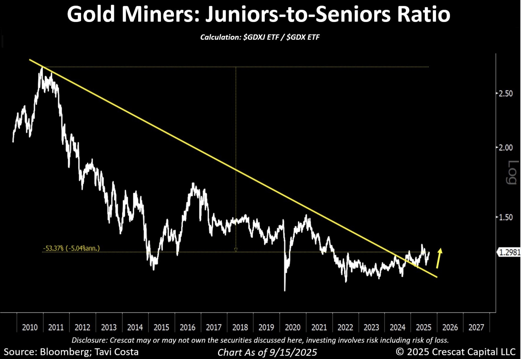 The ratio of junior-to senior mining stocks is still 54% below its 2010 peak.
