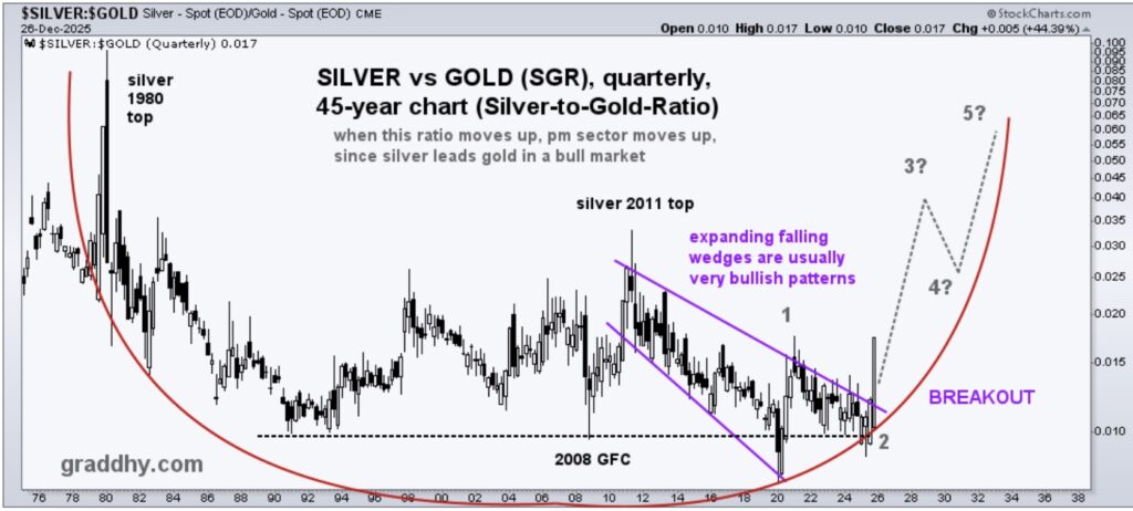 January 6 (King World News) – Graddhy out of Sweden: SGR [Silver vs Gold Ratio] now has a massive, historical breakout in the making, above a 15-year (..!) purple expanding falling wedge.