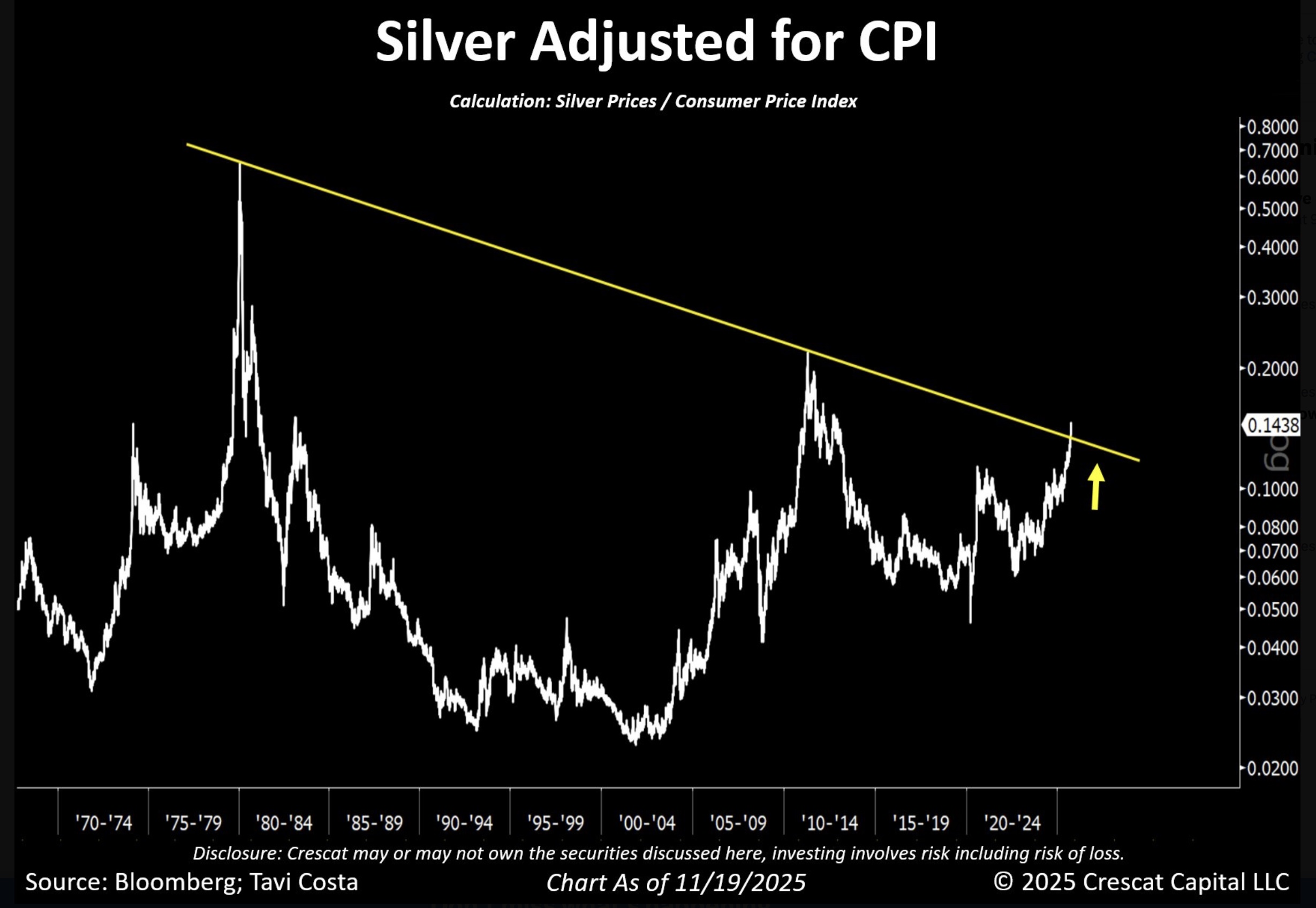 Even after this breakout, silver still sits nearly 80% below its 1980 peak on this metric.
