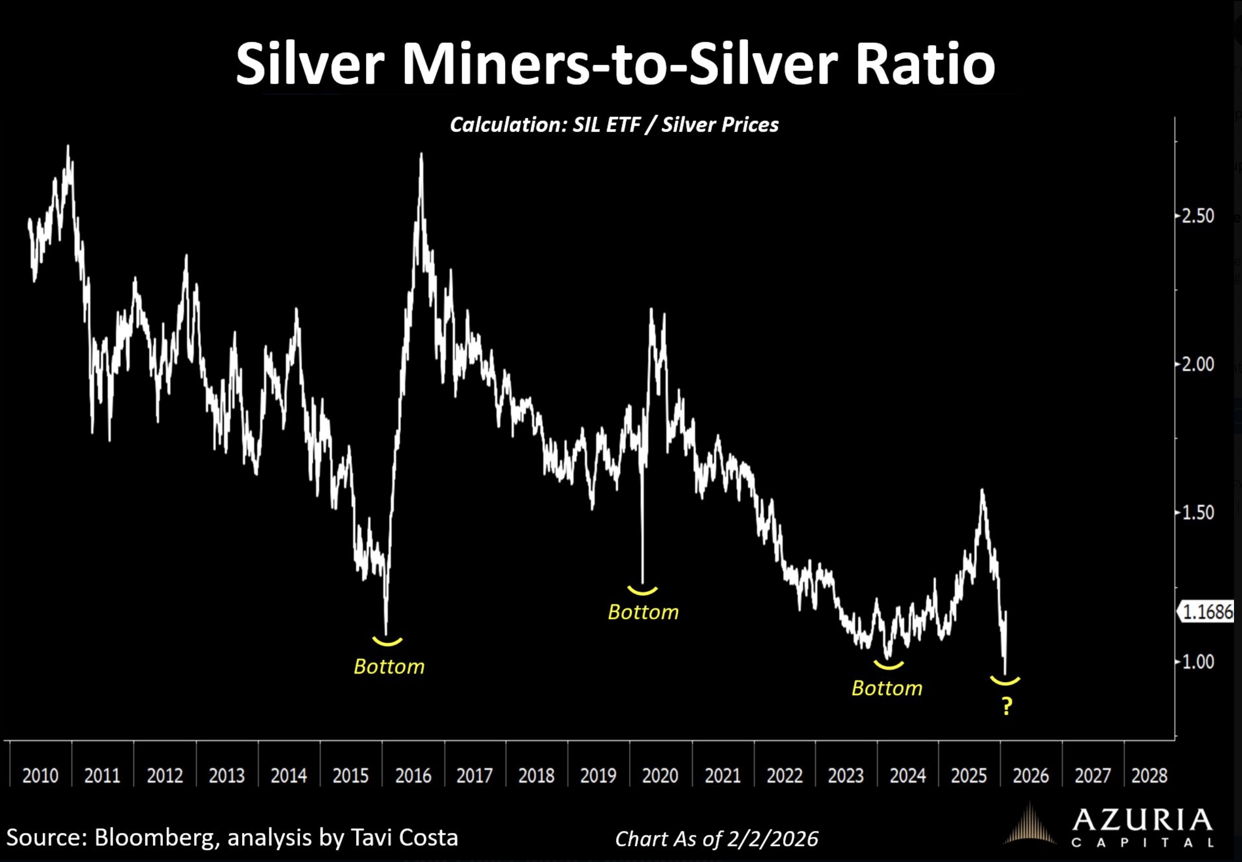 The silver miners-to-silver ratio is currently at one of its lowest levels in history.