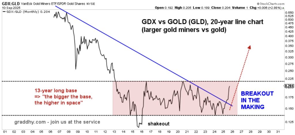 As shared 6 weeks ago, larger gold miners were breaking out vs gold above a 17-year trend line, i.e. larger gold miners just started a new bull market vs gold.