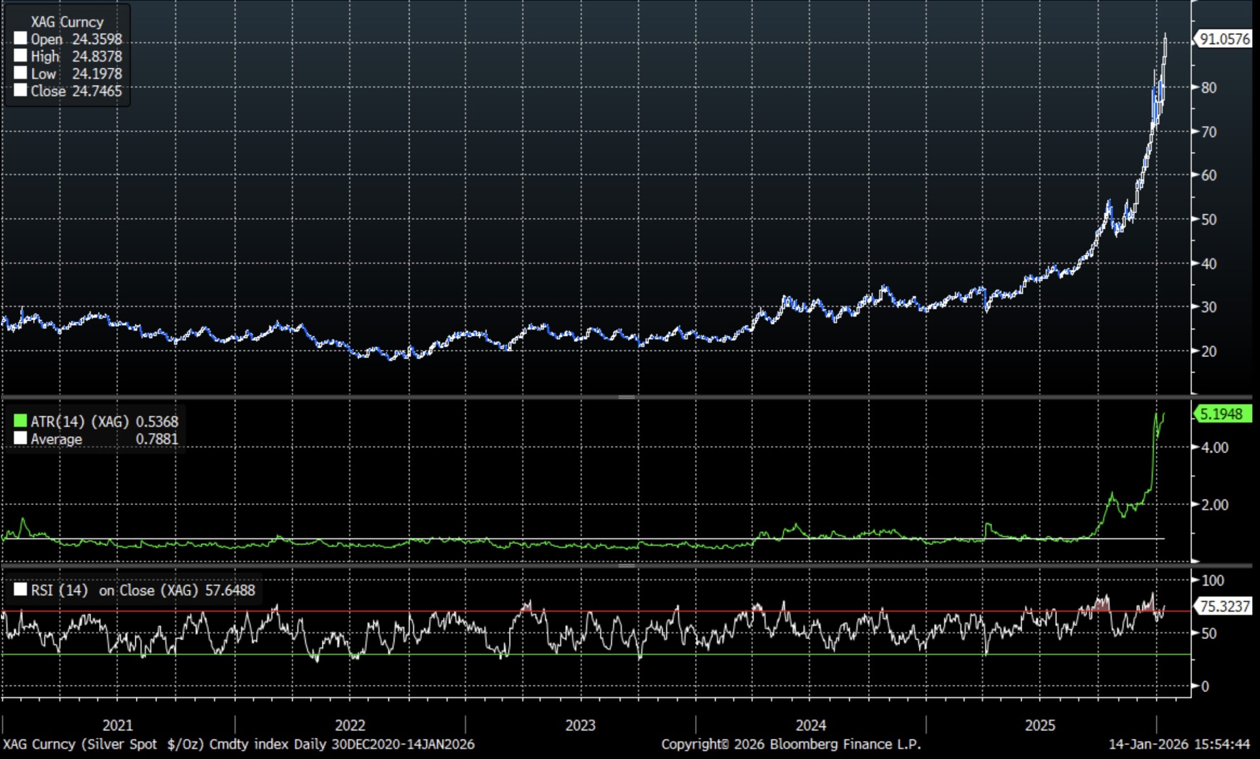 Ole Hansen, Head of Commodity Strategy at SaxoBank: Silver’s 14-day exponential ATR trades near 6% signalling a shift from an orderly market to a volatility-dominated squeeze regime. Daily price swings in percentage terms are now more than double their three-year norm, meaning much of what traders see on the screen reflects forced flows, margin dynamics, option hedging and short covering rather than genuine supply-demand price discovery.