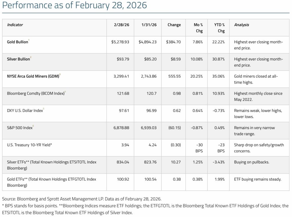 In February, spot gold rose $384.70 per ounce (or 7.86%) to close the month at $5,279.73. It was an all-time monthly closing high and the first monthly close to exceed $5,000. After its violent one-day sell-off on January 30, gold spent February recovering and ended the month only $138.28 (or 2.55%) below its all-time closing high. There was scant evidence that January’s one-day flash crash was anything more than a violent, mechanical reversal as leveraged momentum trades were unwound and forced into liquidation.
