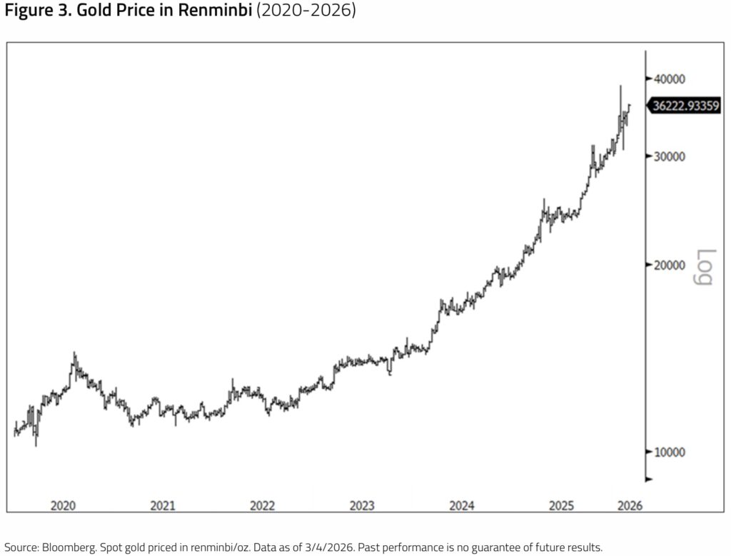 In this context, gold serves as a reference point for preserving value. A renminbi that weakens relative to gold over time allows domestic balance sheets to adjust without the political and financial shock of a visible currency devaluation. This process is slow, opaque and incremental, but it aligns with China’s preference for control over speed. Figure 3 shows that gold priced in renminbi has increased by 187.87% since December 30, 2022, for a compounded annual growth rate (CAGR) of 39.67%.