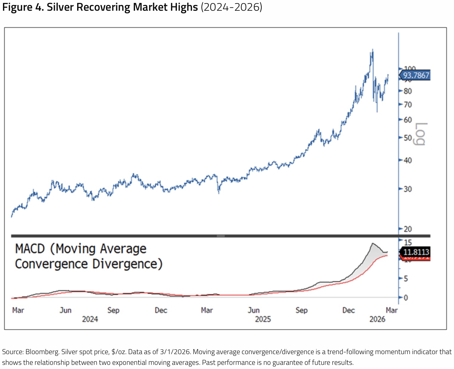 • Precious Metals Volatility: Gold and silver markets experienced significant volatility, including a sharp one-day sell-off in late January, followed by a record monthly close for gold above $5,000 in February.