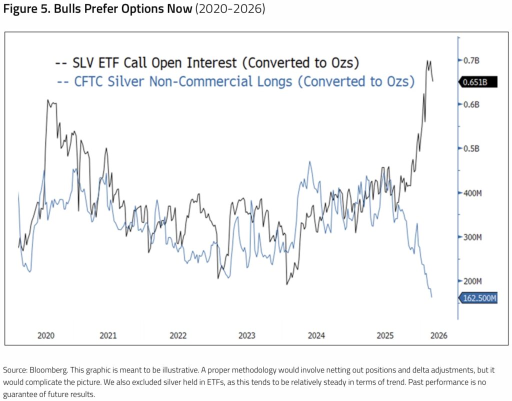 Silver provides a clear example of this dynamic as positioning has shifted dramatically between futures markets and ETF options. Figure 5 shows iShares Silver Trust (SLV) call option open interest (representing ETF options) and CFTC silver non-commercial longs (representing futures markets) converted into notional silver ounces. Futures-based speculative length has declined meaningfully since mid-2025. At the same time, open interest in call options on the SLV ETF has surged to historically high levels. This divergence is likely signaling a volatility regime shift, with risk being expressed differently. Instead of using futures to commit capital directionally, traders are increasingly embedding bullish exposure in options.