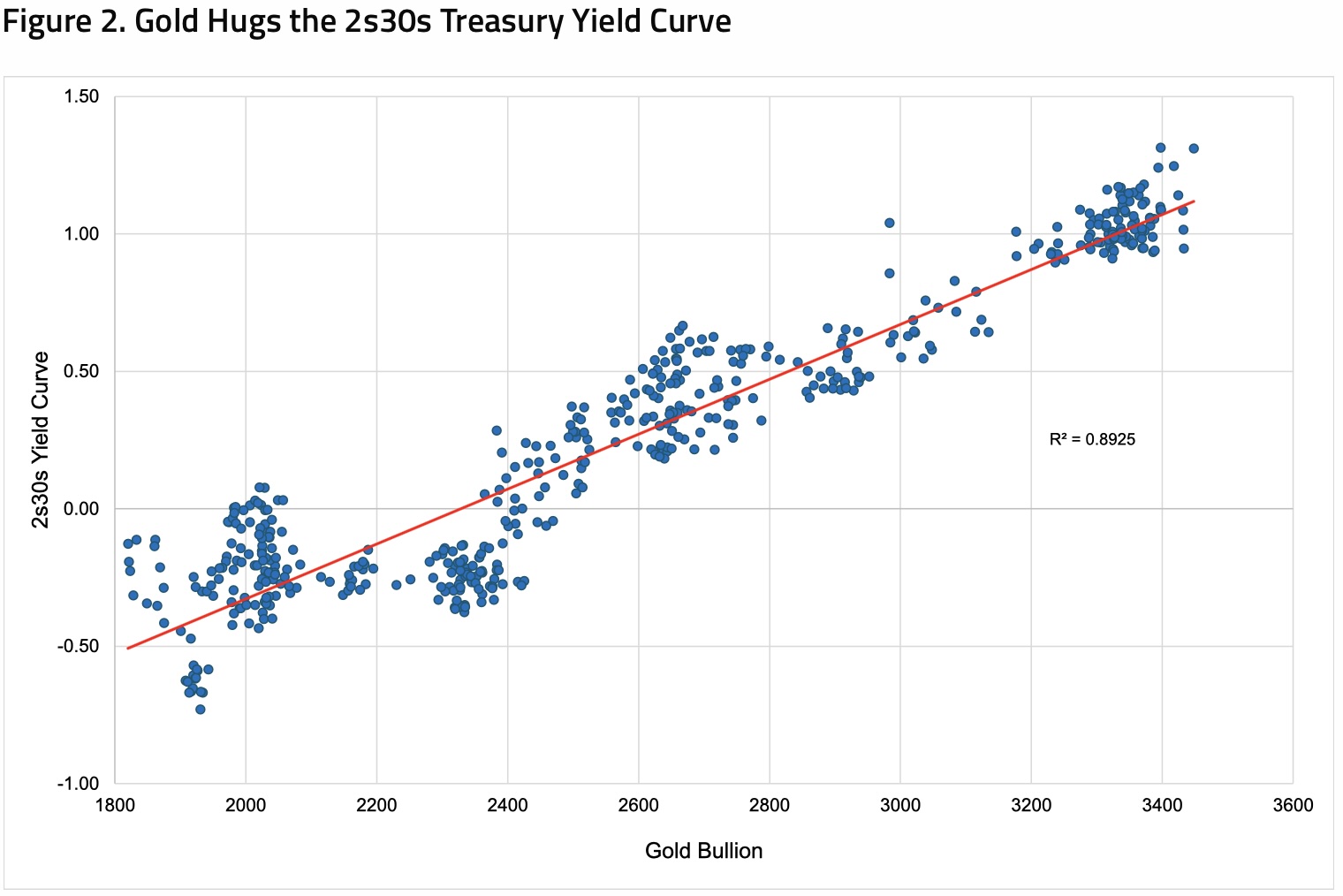 Gold appears to be breaking out of a bullish flag. A two-year regression of the 2s30s Treasury yield curve versus spot gold shows a tight relationship (R² ≈ 0.89), with the fit strengthening recently (see Figure 2). Overall, the steepening yield curve is flashing bullish signals for gold: two-year yields falling on the prospect of lower policy rates ahead, while 30-year yields rise on the threats of persistent inflation risk, higher term premiums and potential fiscal dominance. If uncontrolled steepening pushes policymakers toward YCC, forcing nominal yields below inflation, we expect monetary assets (e.g., Treasury bonds and the U.S. dollar) to erode in real terms, steering flows toward hard assets such as gold.