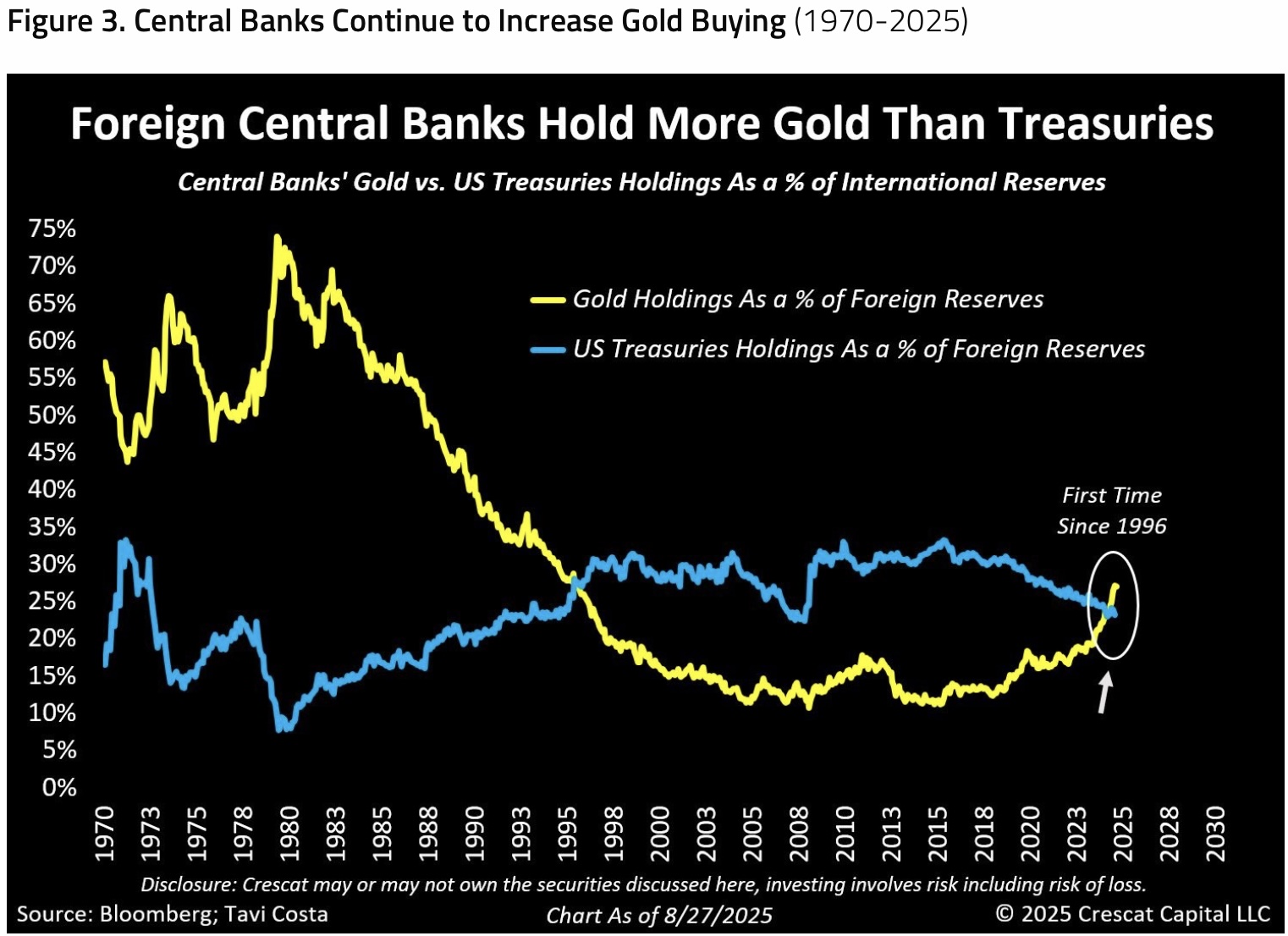 In our view, gold is uniquely positioned for this role. Central banks already hold significant gold reserves, and gold boasts a deep and liquid market and thousands of years of history to give it unmatched credibility. Globally trusted more than fiat currencies, as evident by rampant central bank buying, gold offers a stable alternative in an evolving monetary landscape.