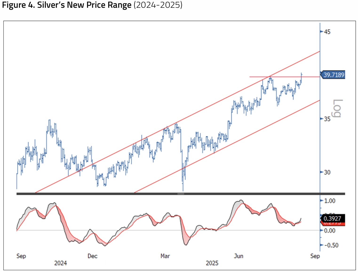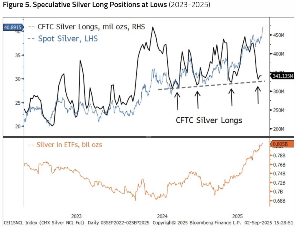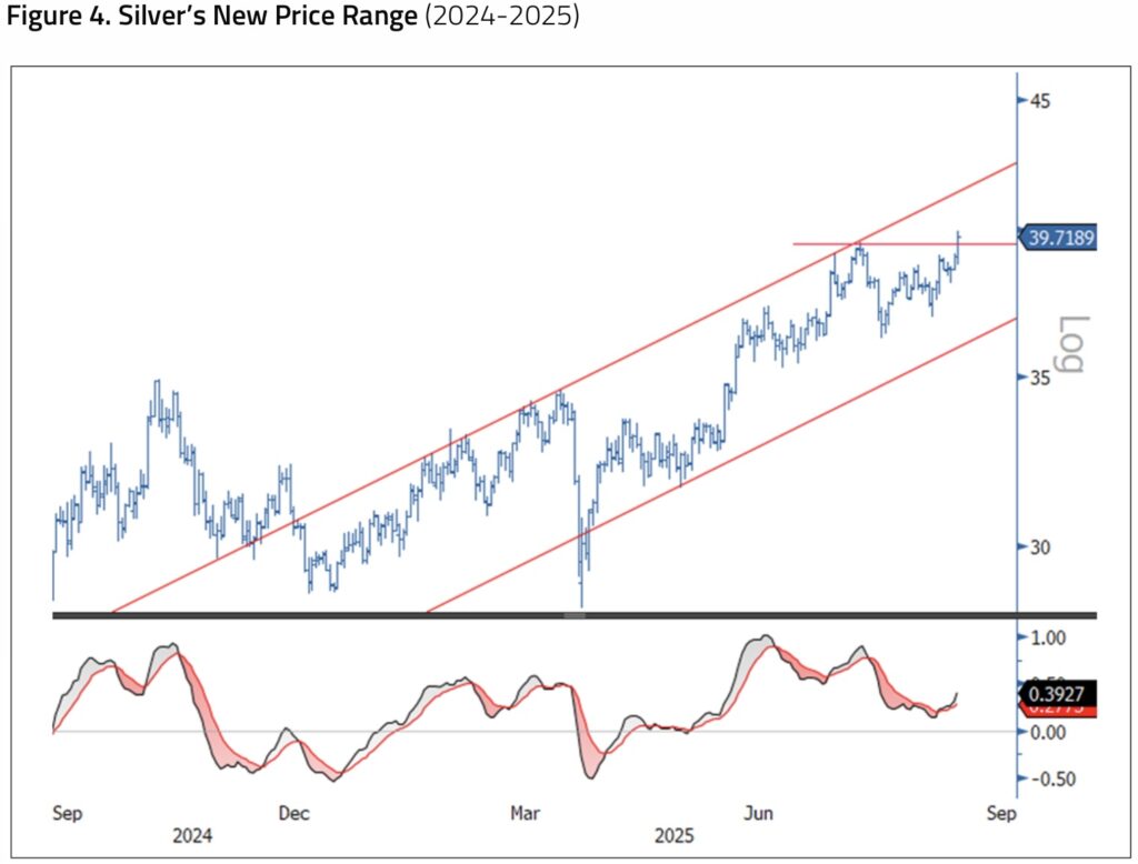 Like gold, silver is one of the strongest-performing asset classes this year. Silver had a short-lived drawdown in early August as copper sold off due to tariff news. Given its industrial demand, silver has a high correlation with copper, and many commodities highly correlated with copper saw a reduction in positions. The selling in silver was short-lived as ETF buyers accelerated buying on the pullback. As seen in Figure 4, silver broke above resistance on the last day of August trading.