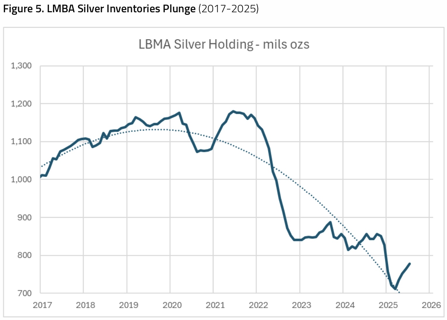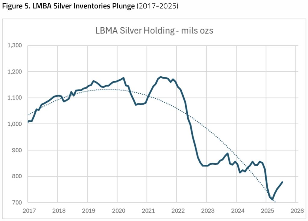 London Bullion Market Association (LBMA) inventories have plunged a third from their 2021 peak (Figure 5). This tightening physical market signals growing liquidity pressure, often a precursor to sharp price moves.