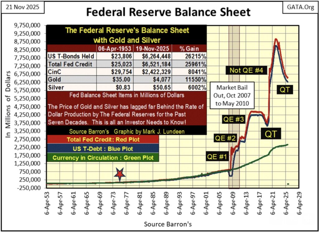 To see the real reason market capitalization for the stock market has increased as it has since August 1971, when the US Treasury decoupled the dollar from its $35 gold peg, look at the Federal Reserve’s balance sheet below.  The inverted Red Star marks October 1975.  In the fifty years that followed, enormous flows of monetary inflation have flowed from the Federal Reserve, into the financial markets, thus bloating market capitalizations in the stock market.