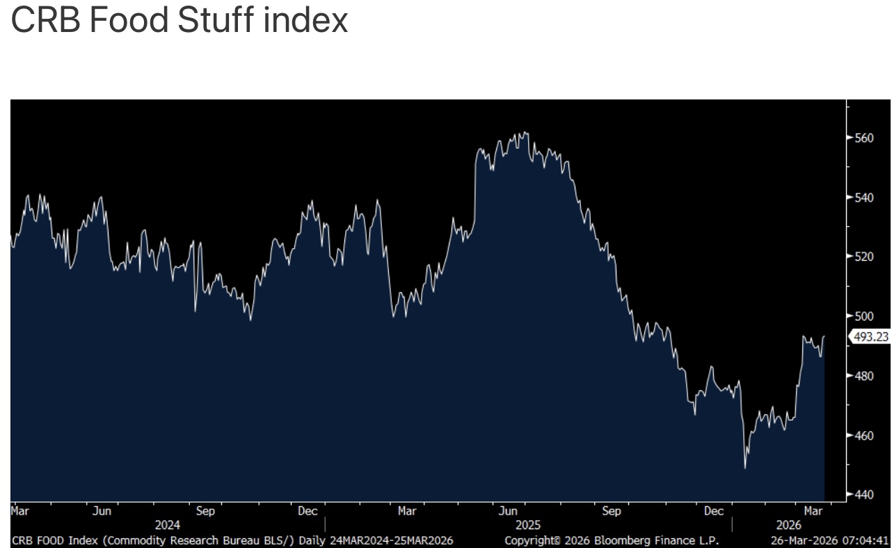 We’re of course watching energy prices but still keep your eye on food prices as the CRB Food Stuff index closed yesterday up a touch but to the highest level since last November. As seen in the chart, there is a lot of upside from here, unfortunately. We remain long some fertilizer stocks. From the perspective of the farmer, with higher fertilizer and fuel costs, they really need higher crop prices as the planting season gets underway.