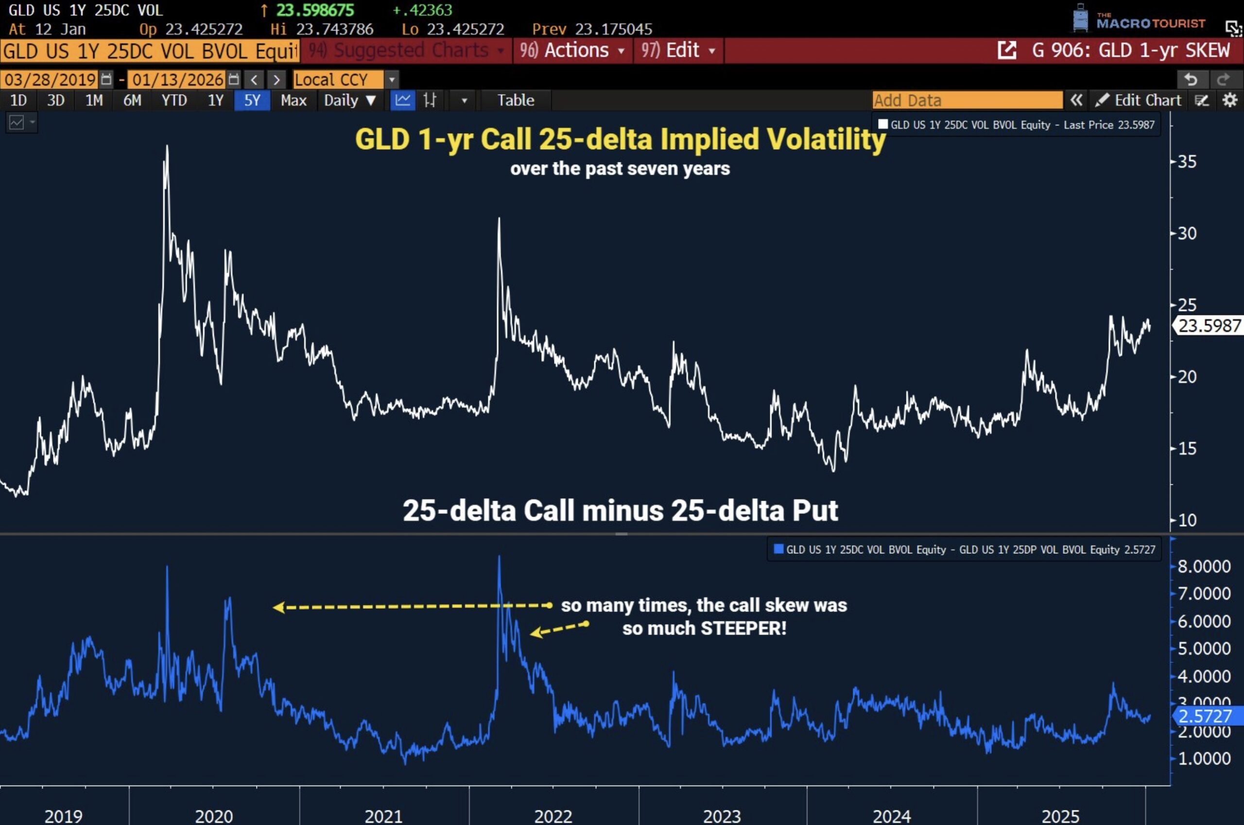 “Gold exploded to a new high today, but the upside implied volatility is still relatively well behaved, and the call skew is stubbornly offered. Will gold not peak until we get a spike in call skew?”