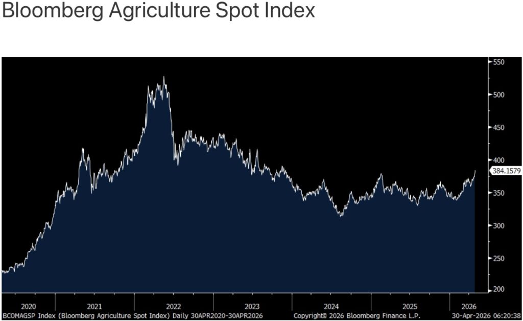 Peter Schiff: Yes we of course watch the price of crude oil and products each day but the Bloomberg Agriculture Spot Index is breaking out to the upside to the highest since November 2023. It still is well below the peak seen in 2022 but the chart looks like there is plenty of upside. Relief for farmers but not for those of us who eat. In this index is corn, wheat, soybeans, soybean oil, soybean meal, coffee, cotton and sugar.