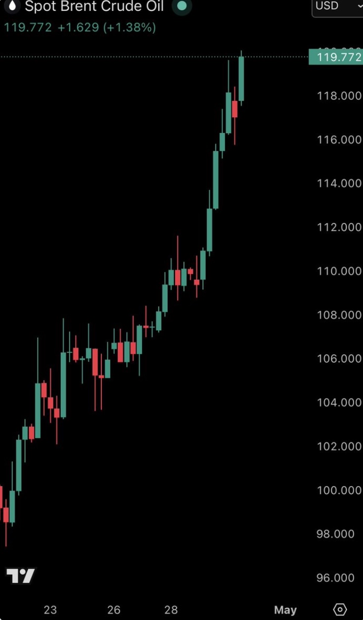 Brent crude oil prices just broke above $120/barrel for the first time since June 2022.