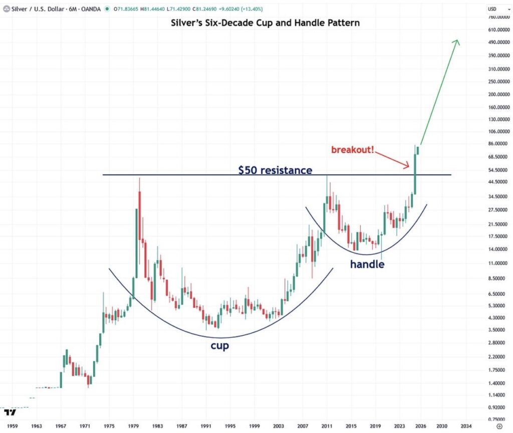January 8 (King World News) – Jesse Colombo: Another reason why I believe $100 silver is in the cards is that it recently broke out from a six-decade-old cup and handle pattern, and based on the sheer duration and magnitude of that pattern, it projects silver surging to hundreds of dollars an ounce in the course of this bull market that I see lasting at least another 7 to 8 years.