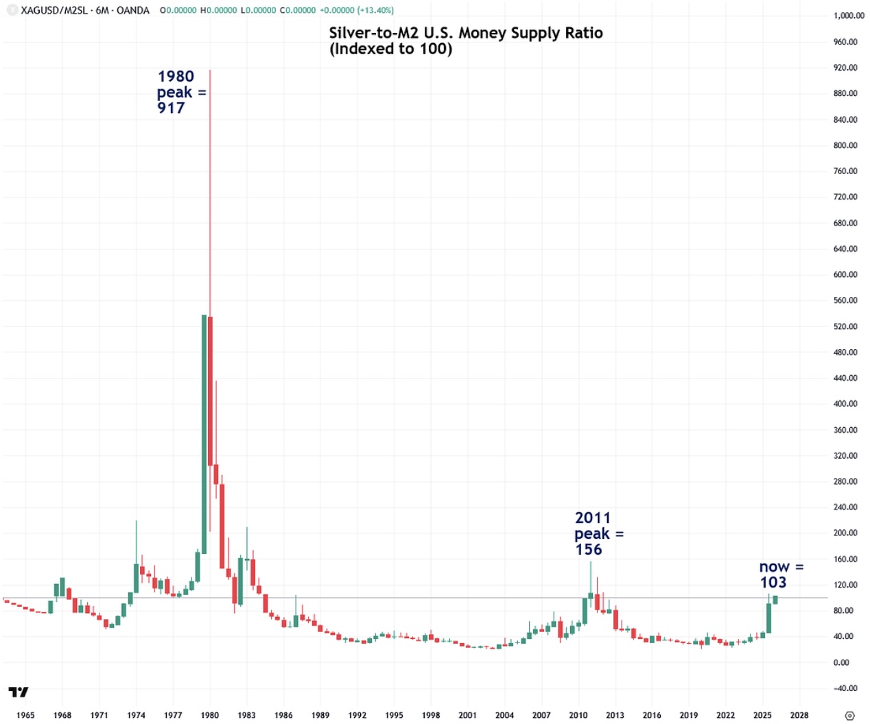 This shows the price of silver would have to skyrocket to $917 to equal the 1980 peak.