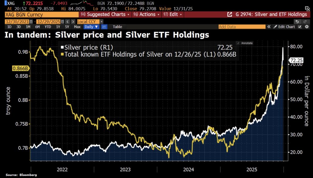 December 30 (King World News) – Holger Zschaepitz: The chart highlights that Silver’s rally over the past six months has been strongly supported by inflows into silver ETFs. Recently, those inflows have faded, which helps explain [Monday’s] pullback. What’s notable is that even though silver is trading near record highs, silver ETF holdings remain well below their historical peaks.