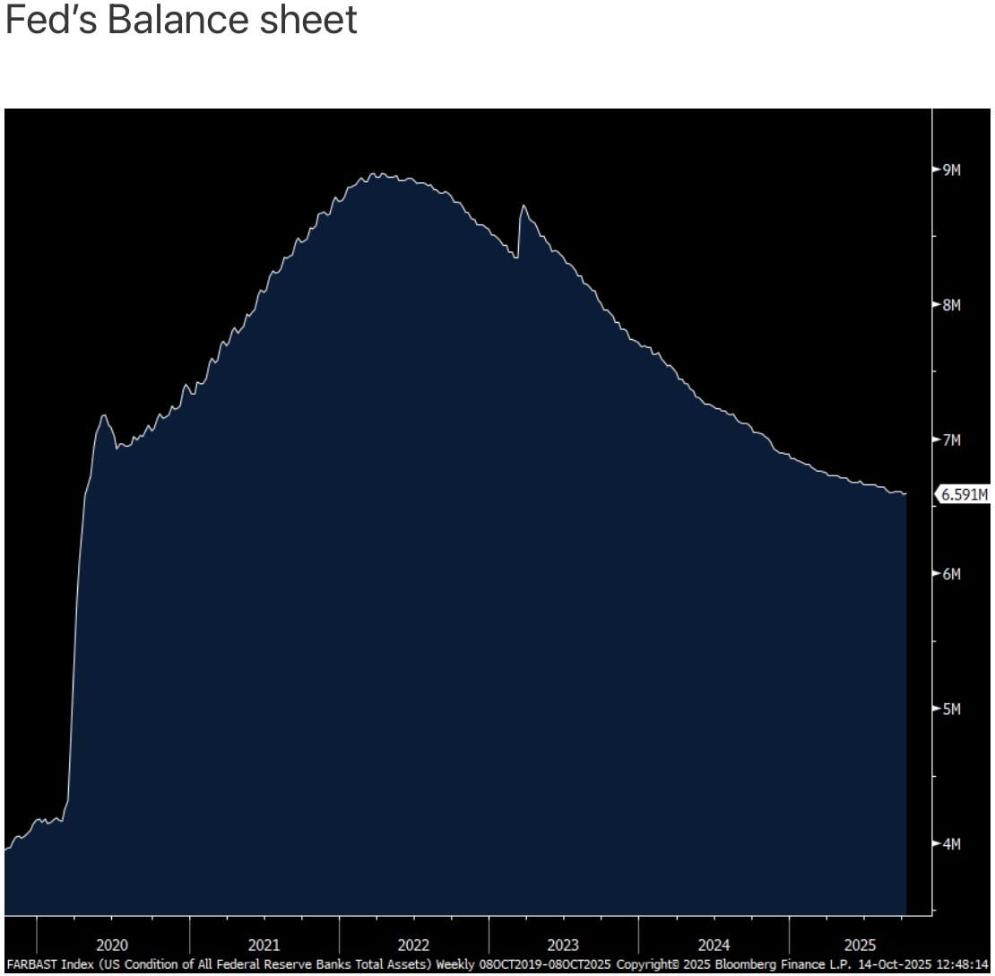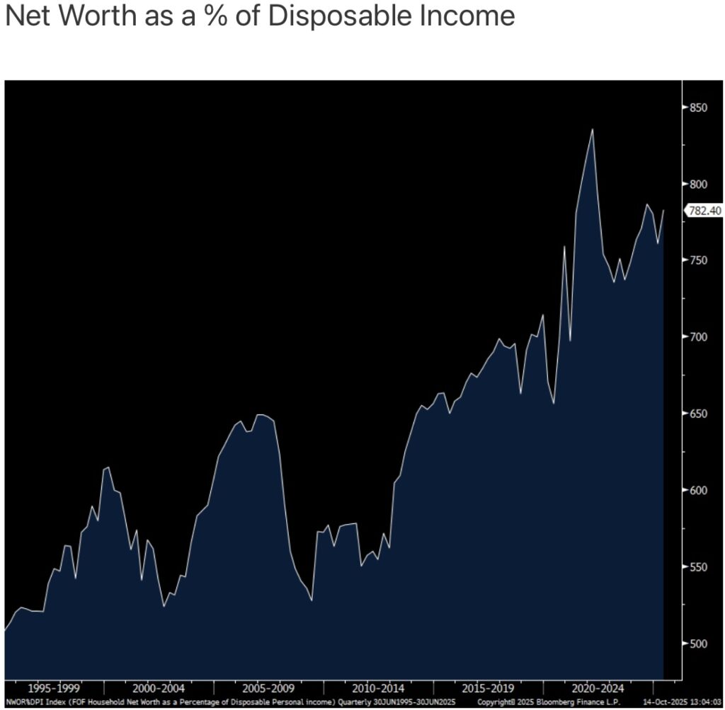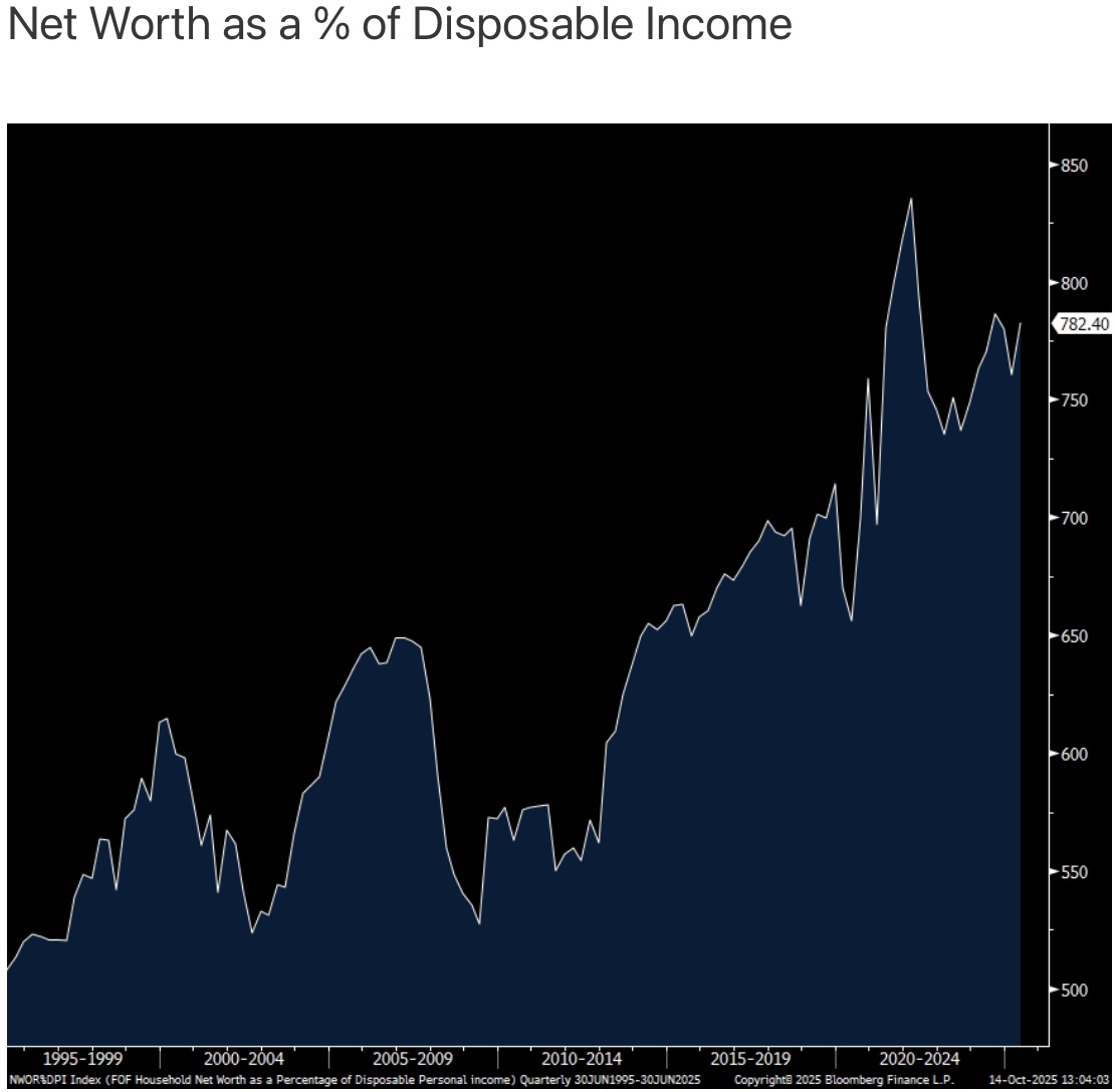Bottom line, QT is about to end, and has essentially already ended for Treasuries and why there was no response today in the market to what he said. We’ll see if spreads between Treasuries and MBS tighten from here. I think QE (and saying nothing new from me), outside of the 2008-2009 experience with its use, has been a very dangerous use of monetary policy that has resulted in the unaffordability of housing for many (which followed the experiment of a 1% fed funds rate in the early to mid 2000’s that resulted in the obvious) and bubbles in various asset prices that has brought the net worth as a percent of disposable income to 782% as of Q2 2025. That compares with 614% in Q1 2000 and 649% in Q1 2007. Steve Eisman years ago poetically referred to QE as ‘monetary policy for rich people.’ What an incredible ride for asset and home owners but what a tough road it’s been for everyone else.