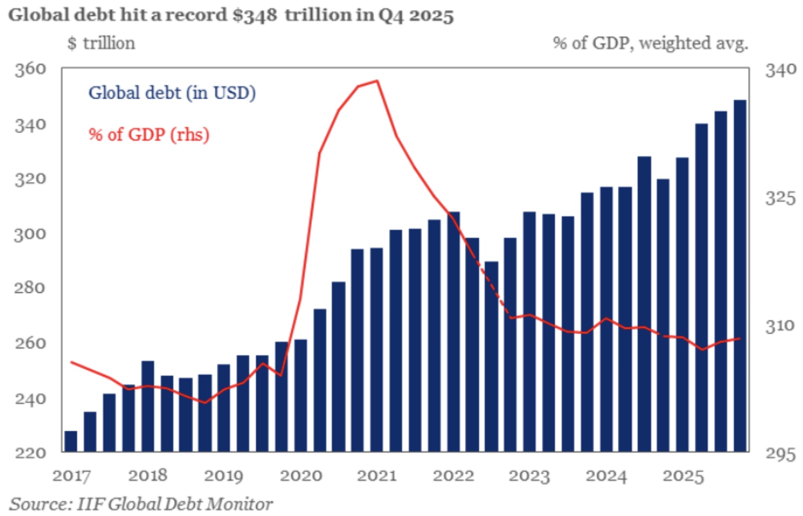 February 25 (King World News) – Holger Zschaepitz: Global debt is surging as governments ramp up spending on national security and economic resilience. Nearly $29tn was added to global debt in 2025, pushing the total to a record $348tn, acc to IIF.