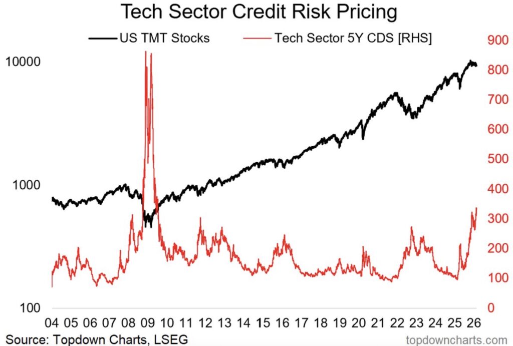 The Daily Shot: Tech sector credit spreads are trending higher.