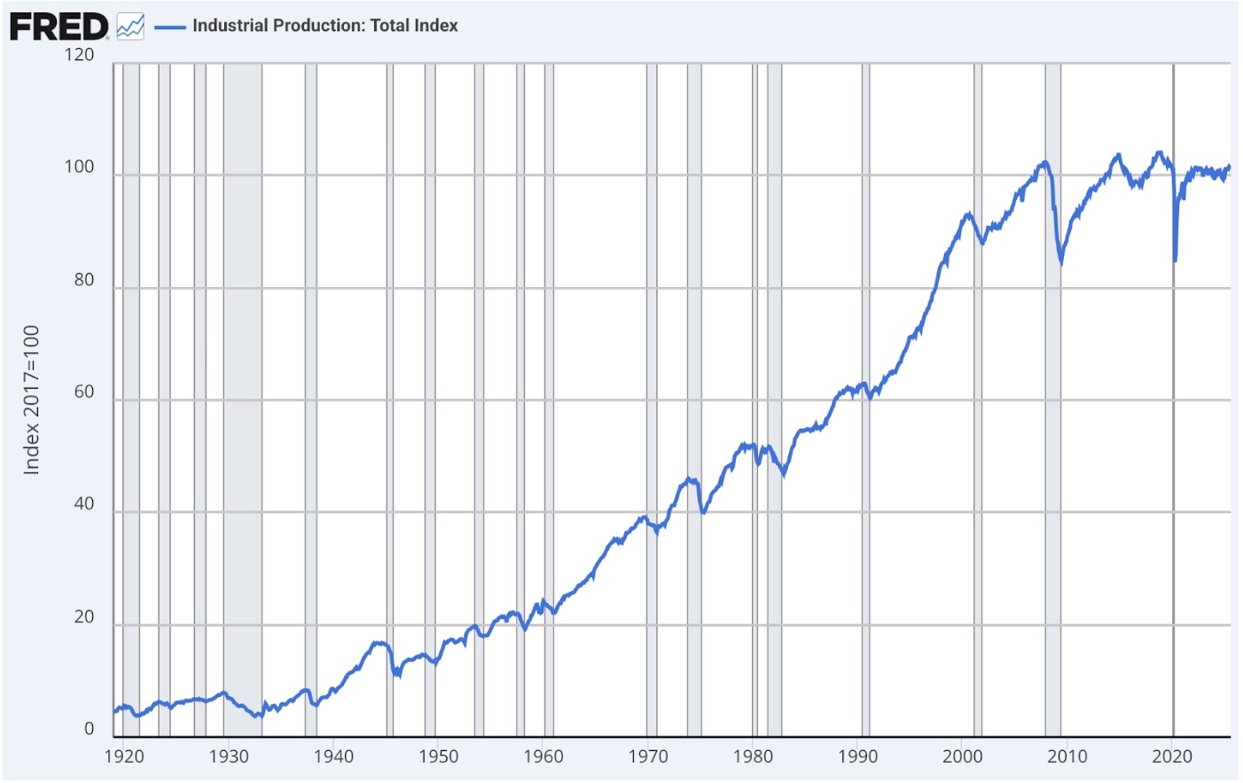 Credit recorded in GDP finances consumption, production (including investment), and government spending. Only credit for production and investment in it leads to price stability. But US industrial production is lower than in 2008, when on the Federal Reserve Bank of St Louis’s total index, it was 102.38 compared with 101.27 last:
