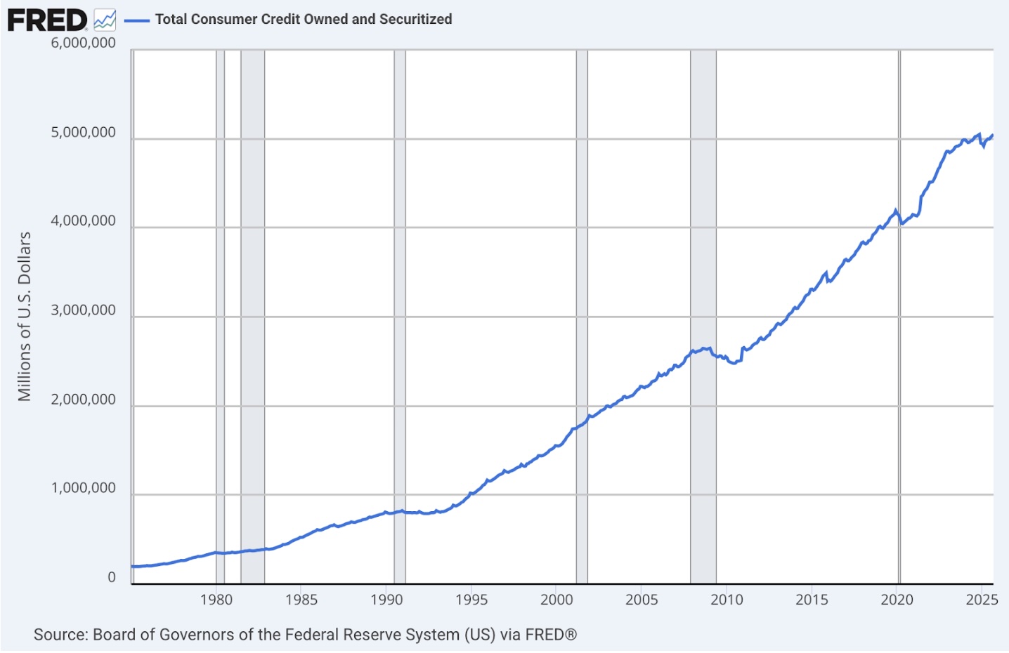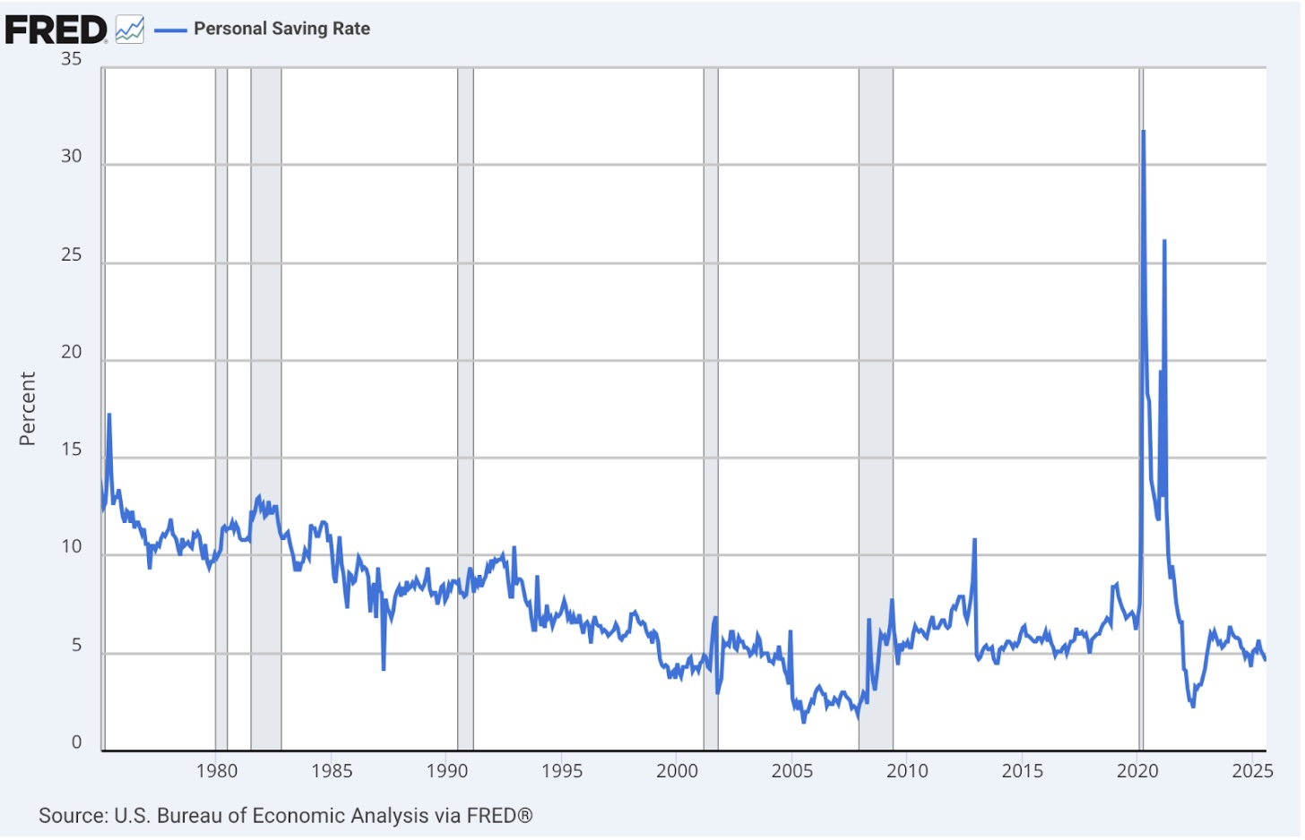 Other than the spikes during the COVID lockdowns, when no one could spend, the long-term savings trend is down. Not only are savings down, but consumer debt is up: