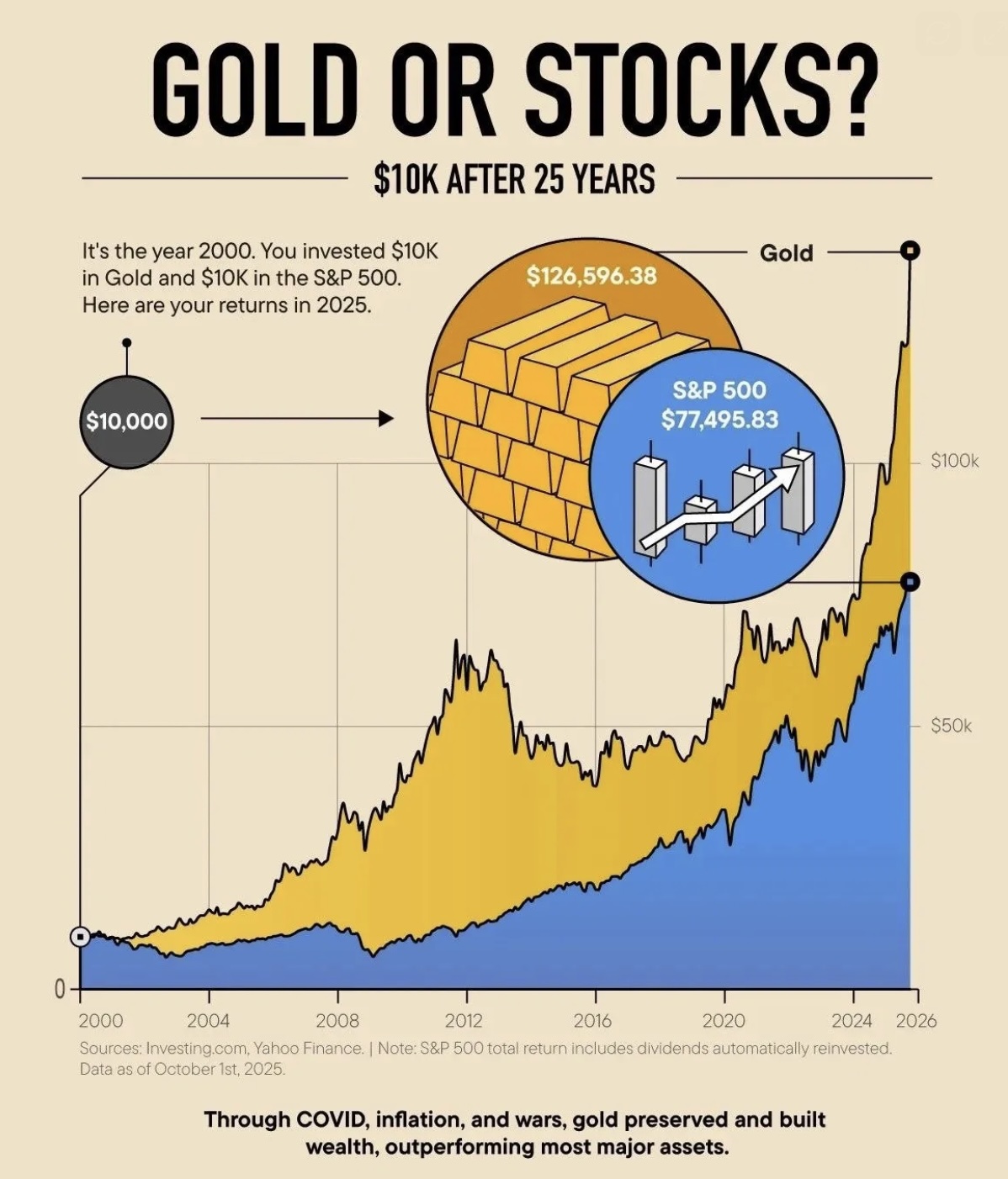 What is $10,000 worth after 25 years? In the S&P 500, it grows to $77,495, pretty impressive. But in gold? The investment multiplies by 12.6×, a return of 1,160 percent.