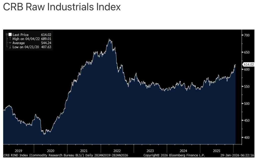 This move in industrial and precious metals continues on and the pace of gains is astonishing to see. The CRB raw industrials index closed yesterday at a fresh 3 ½ yr high, helped by copper.