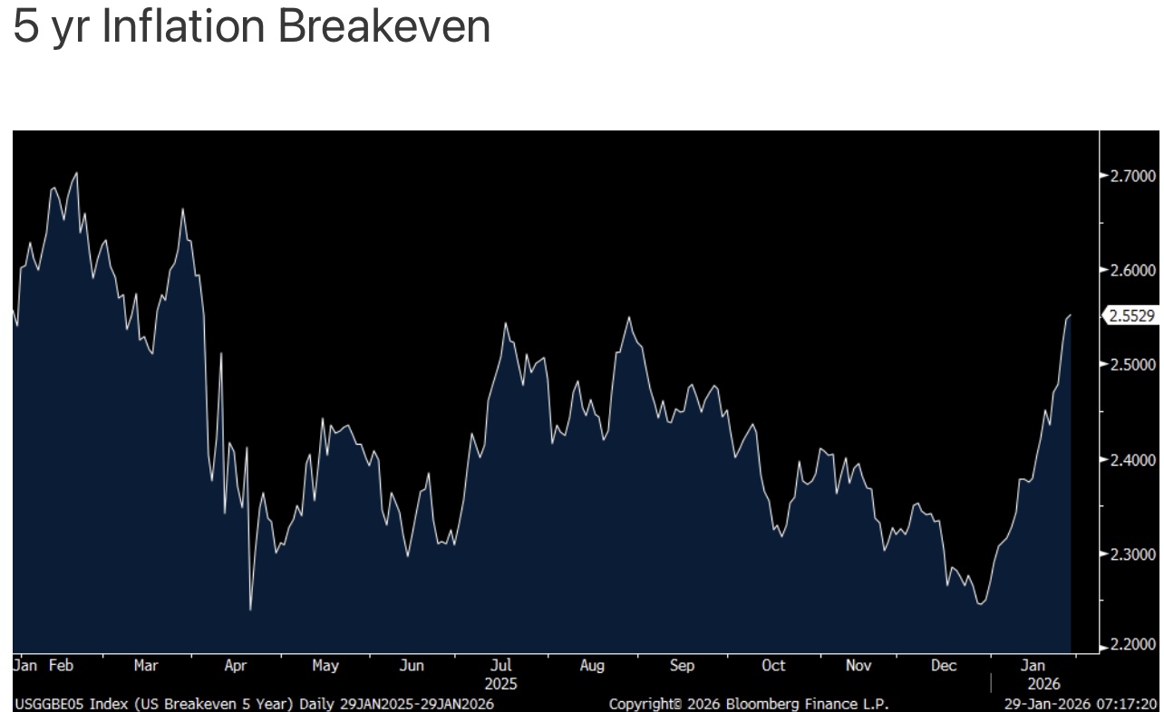 If I’m right, the upcoming new Fed Chair is going to have a real dilemma on his hands. The 5 yr inflation breakeven at 2.55% matches the highest since last April.
