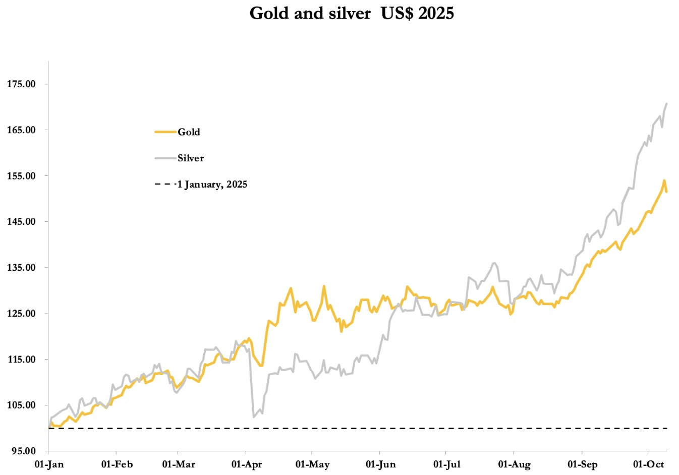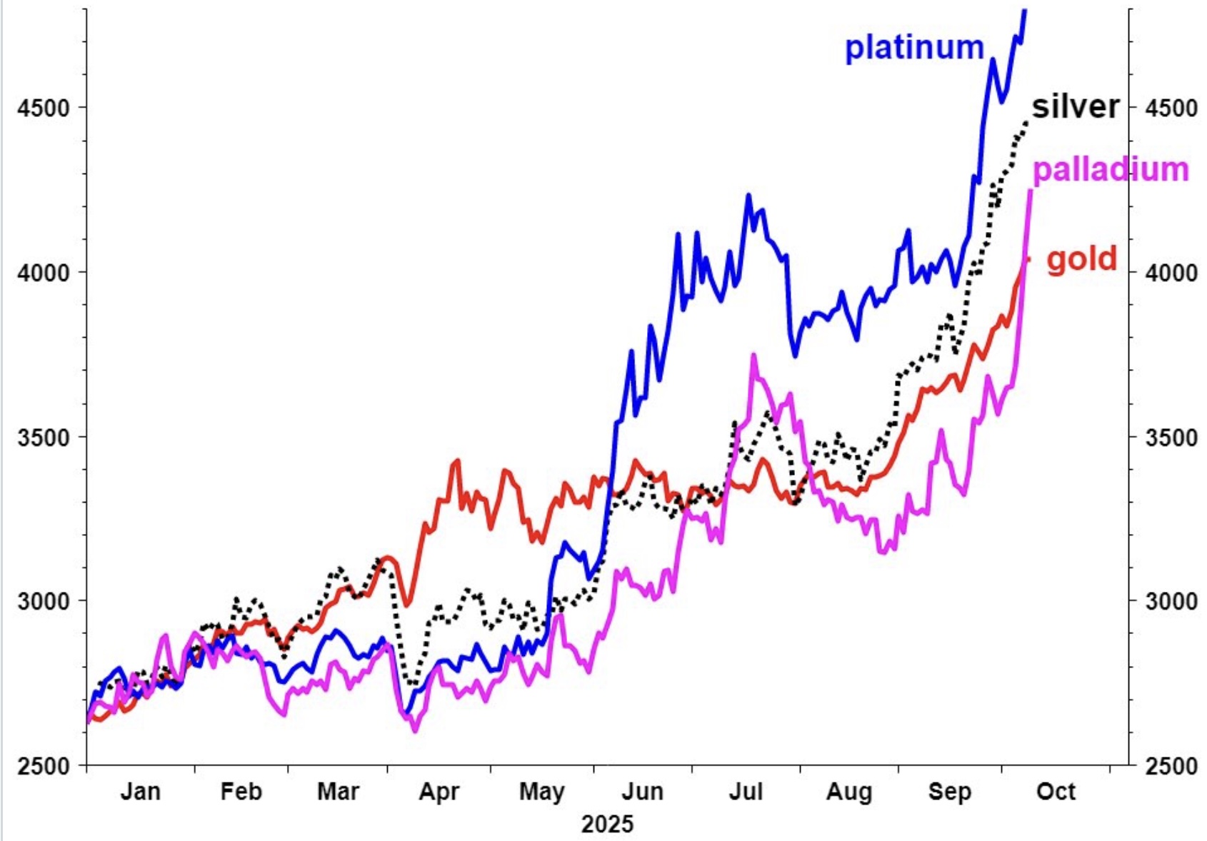 As our headline chart below shows, as of last night’s close (Thursday), silver has risen by 76% this year so far, outpacing gold which is up a hefty 52%. Palladium also rose strongly, up 13% on the week and 59% on the year, and platinum is up a whopping 73% since 1 January. Even copper is moving higher, up 3.9% on the week and 21% on the year.