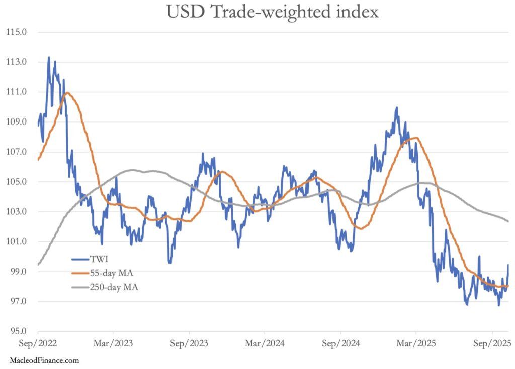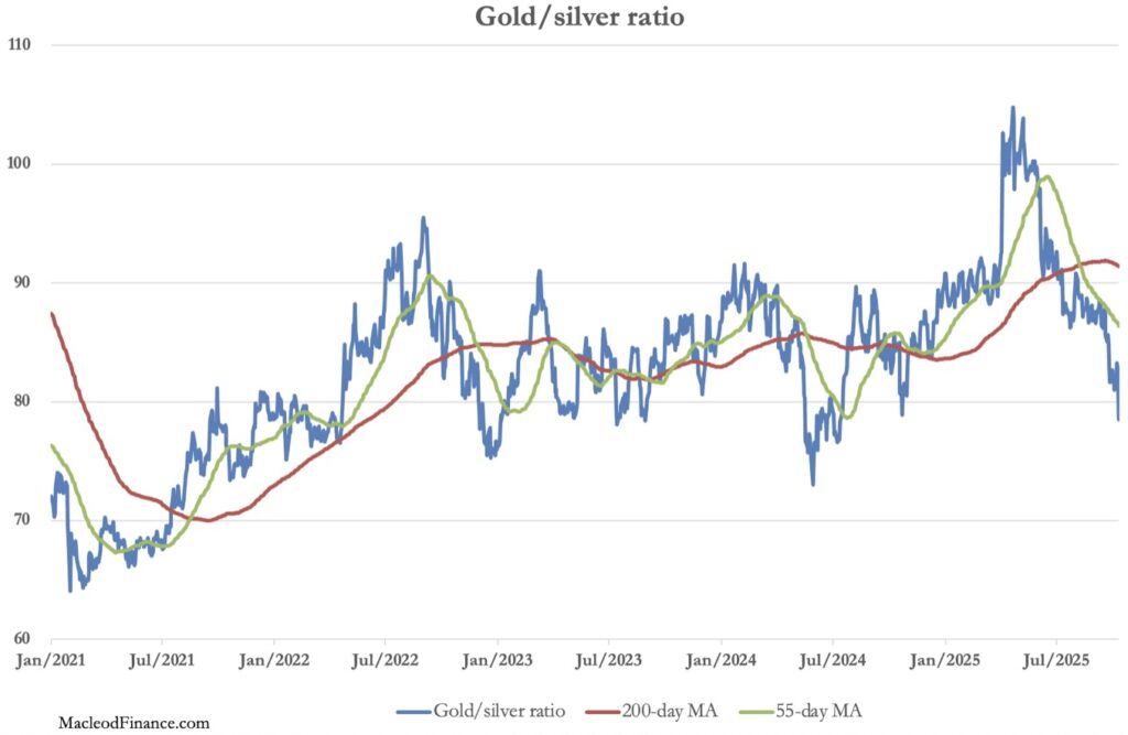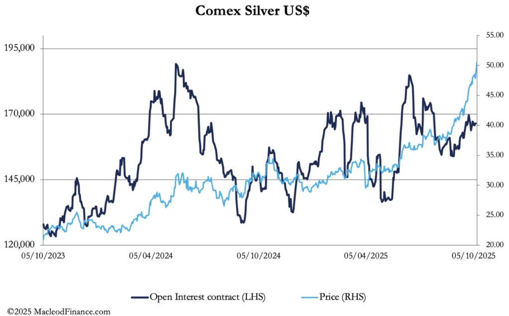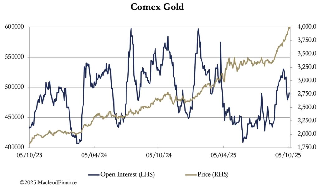 In European trade this morning, gold was $3994, up $110 from last Friday’s close. And at $50.90, silver rose $3.00 over the same time scale. Physical liquidity in silver is particularly short, with lease rates reportedly at 19% at one stage, reflecting none being available to cover forward contract deliveries in London.