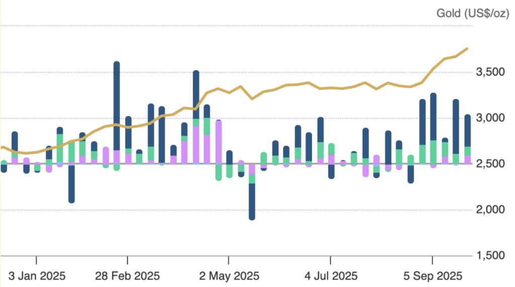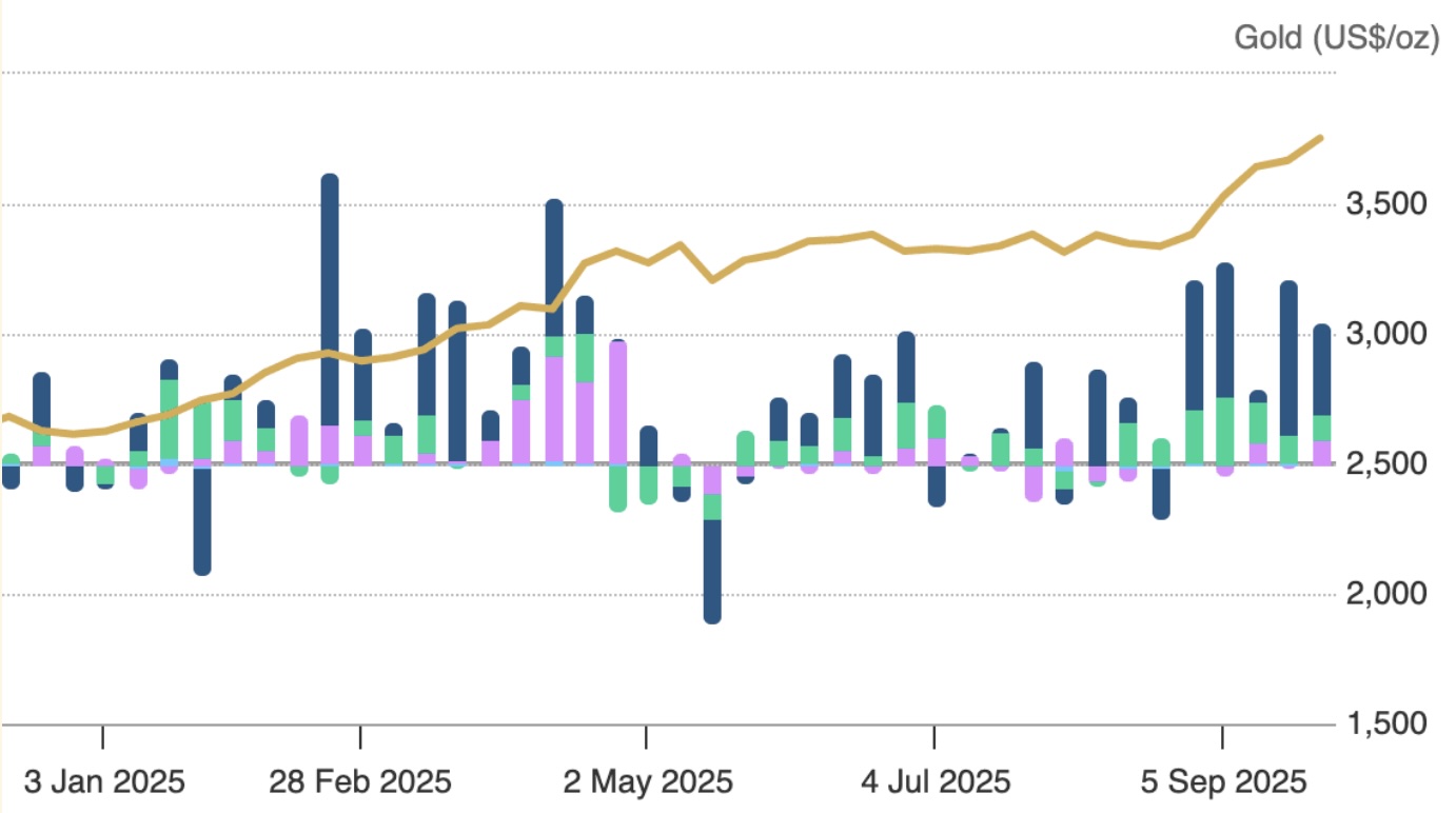 The bars are weekly totals of net global ETF demand, with dark blue being North American ETFs. They don’t tell the whole story, because authorised participants sell short ETFs and deliver borrowed stock in exchange for bullion. For example, at end-September short interest in GLD stood at 11,890,650 shares or 3.42% of the outstanding. Note that this represents double ownership, compromising innocent holders, as well as suppressing apparent demand.