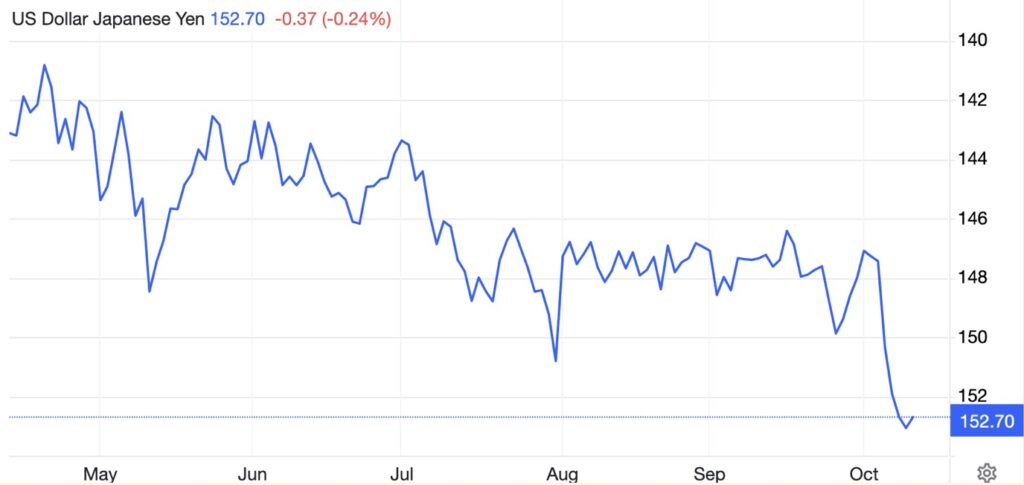 In currencies, the major development was the substantial decline in the Japanese yen, reflecting the election of Sanae Takaichi to head the ruling party and therefore will be the next prime minister. Ms Takaichi is expected to increase public spending to support business, and while the Nikkei soared on the news, the yen took a tumble: