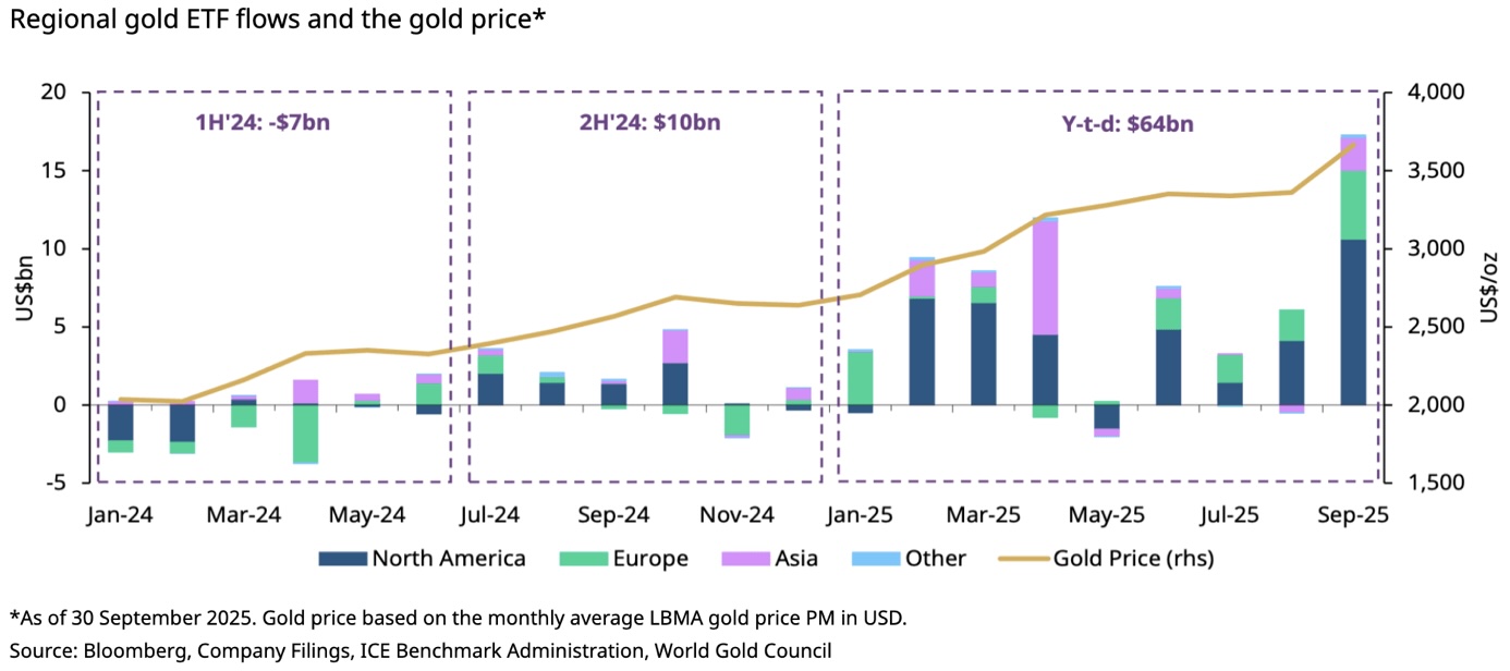Investors are also missing out, belatedly buying into ETFs on a scale that’s still very small compared with the amount of investible funds. The chart below from the World Gold Council shows how September’s ETF inflows have jumped: